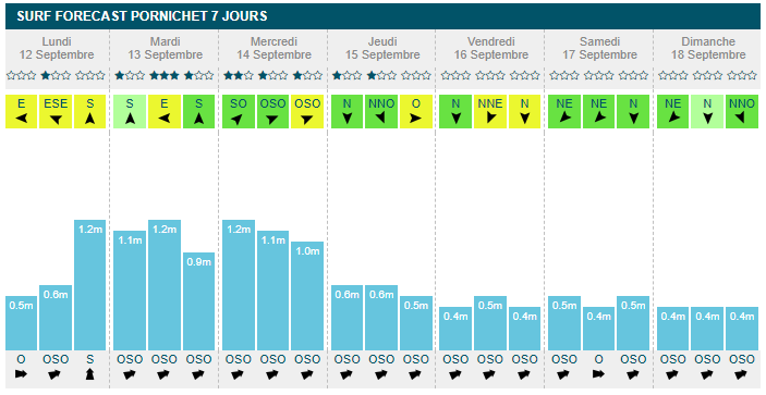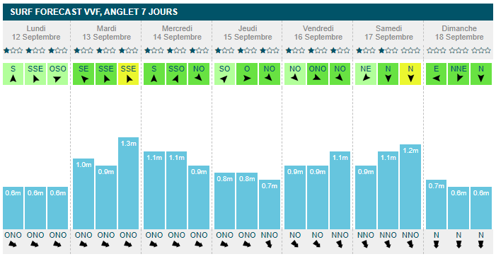 Par la suite après une brève chute de la période, un regain à 15s permettra une session mercredi en fin de journée : 1m60 à la série, vent onshore à 11 km/h.
