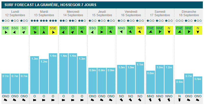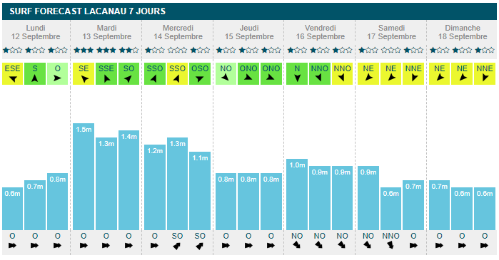 De belles sessions à trouver en début de semaine dans les Landes ! La première mardi matin : 1m30 à la série, 12s de période et vent offshore à 11 km/h. Une seconde mercredi, notamment en fin de journée : 1m20 à la série, 15s de période et vent proche de l'onshore à tout juste 7 km/h.