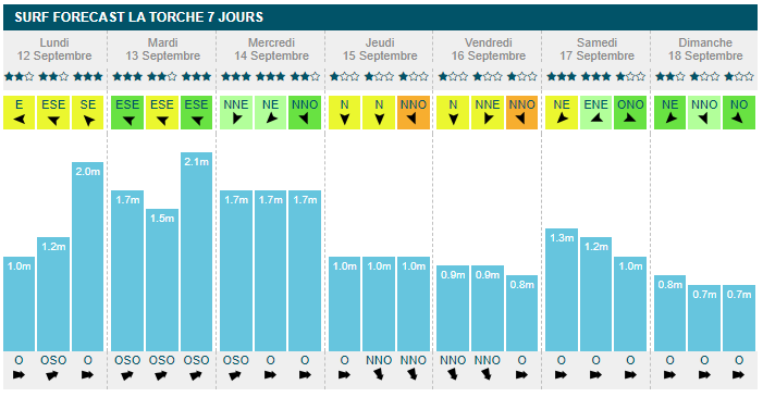 Des conditions intéressantes reviennent dès samedi en début d'après-midi : 1m20 à la série, 12s de période et vent proche de l'offshore (Est Nord Est) à 7 km/h. Plus petit mais propre, on devrait également trouver des conditions dimanche : 80cm, 11s, vent de Nord Est à 13 km/h.