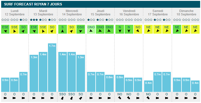 Comme ailleurs, la première session de la semaine et peut-être la plus intéressante se distingue dès mardi, avec 1m40, 12s de période et un vent proche de l'offshore à 17 km/h mardi matin.