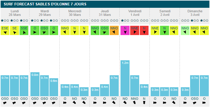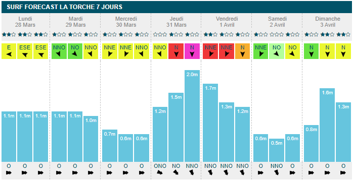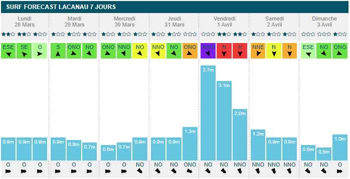 Les planètes ne s'alignent pas cette semaine. Dans les Landes, on trouvera légèrement plus de taille que les départements au nord, mais une orientation du vent toujours pas idéale, due notamment à la hausse des températures extérieures. Une session accessible aux débutants est à trouver mardi dans la journée, le vent proche de l'onshore restant autour des 10km/h, (11s de période).