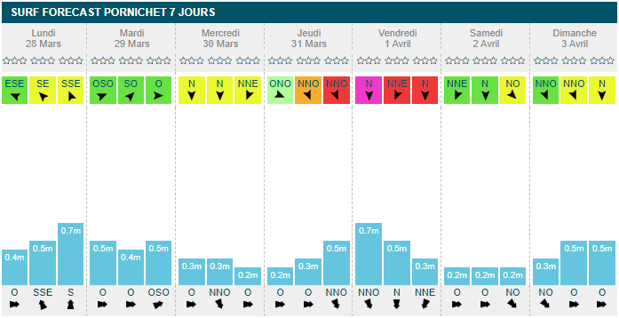 Par la suite, le vent proche des 30 km/h (et jusqu'à 40 km/h jeudi et vendredi) sera un frein à la mise à l'eau. Il faudra attendre l'accalmie du week-end, malheureusement accompagnée de la chute de la houle : session pour débutants dans 50cm samedi matin.