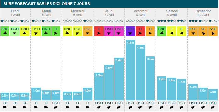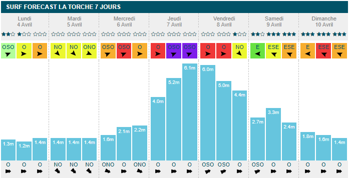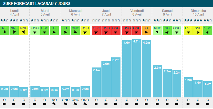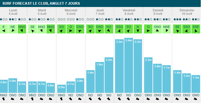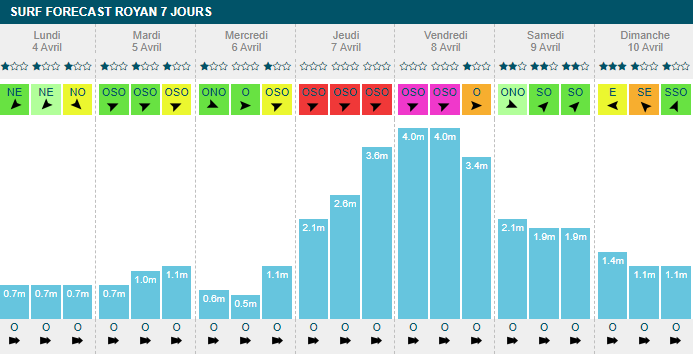 Par la suite, il faudra attendre le week-end pour espérer se remettre à l'eau, et avec un peu plus de taille. Samedi matin devrait être un beau créneau : 1m90 de houle, jusqu'à 2m10 à la série, 11 secondes de période, vent offshore léger. Ce 9 avril sera d'ailleurs à privilégier, la journée du lendemain subissant une hausse du vent onshore.