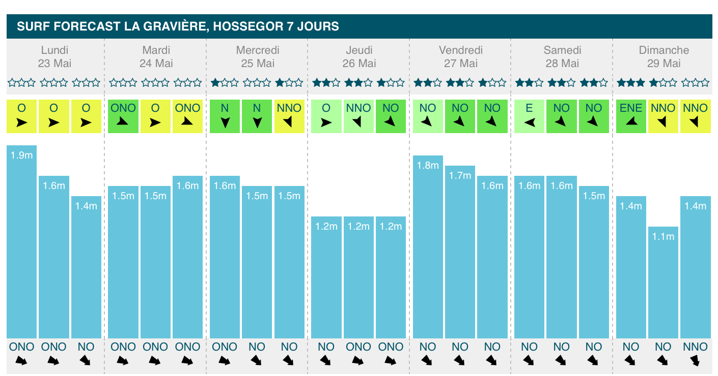 Si le vent soufflera avec intensité en début de semaine et principalement mercredi, il devrait se calmer à partir de jeudi. Avec une tendance on-shore sur toute la semaine, c'est sur le week-end que le vent devrait s'orienter off-shore et donc améliorer la qualité du plan d'eau. Toutefois, la houle de la semaine n'est pas à négliger si vous privilégiez les spots de replis !