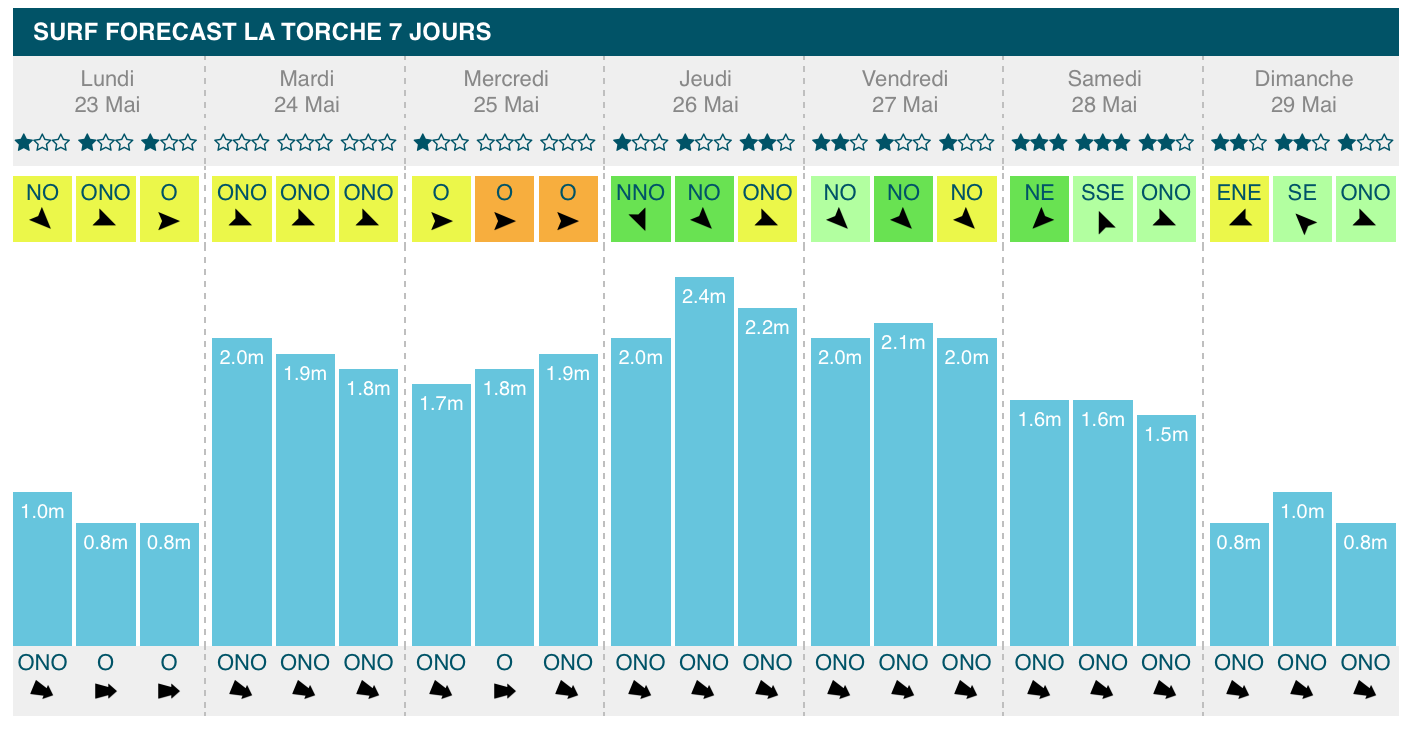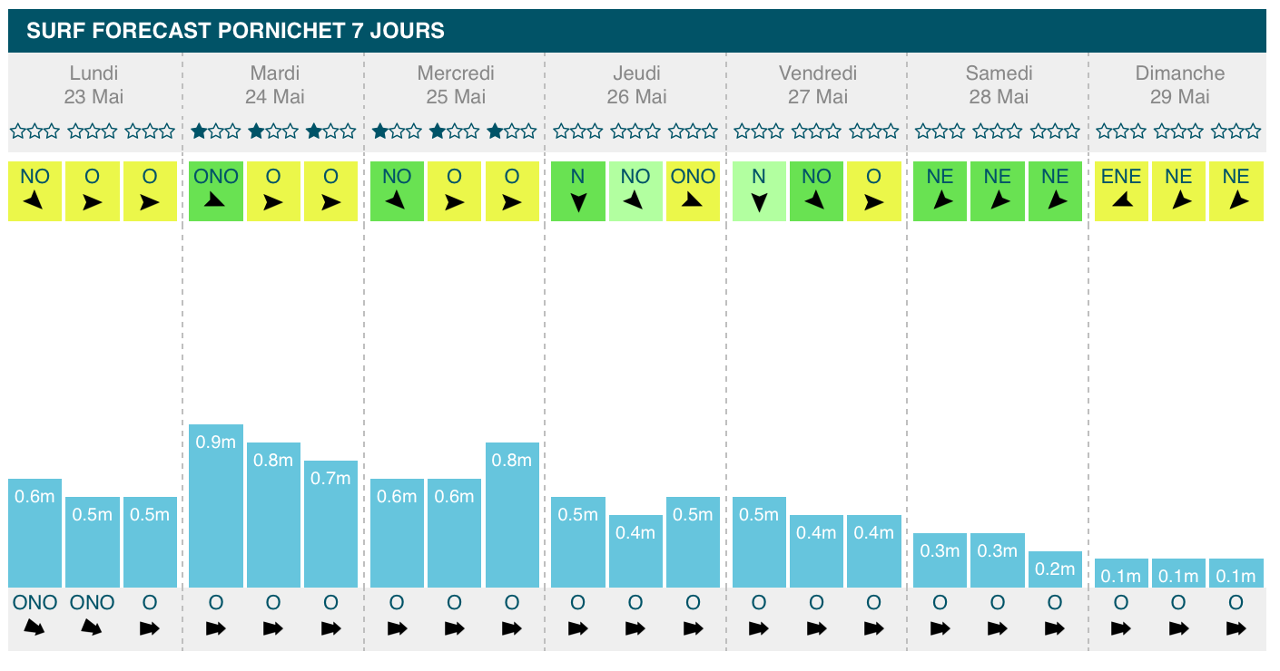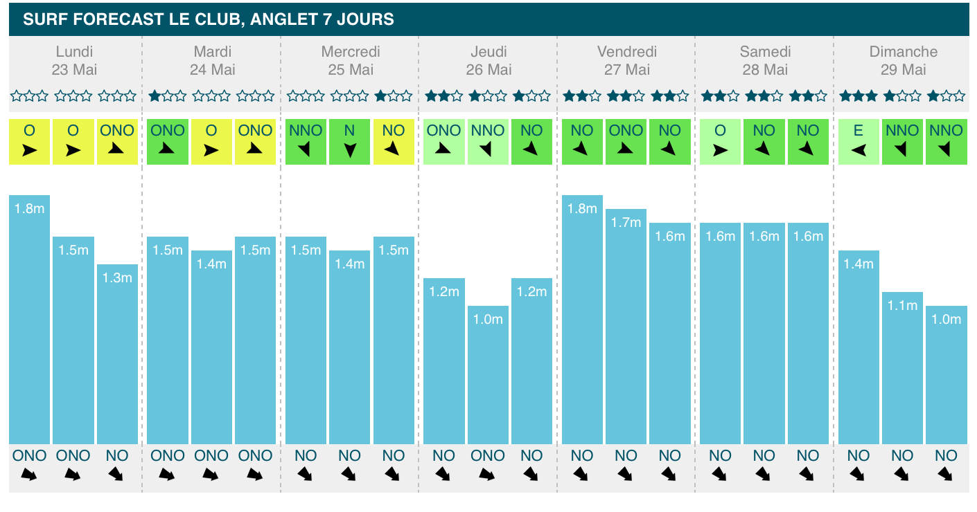 Quelques pronostics : Pour les confirmés qui voudraient être à l'abri des foules ce week-end, de belles sessions vous attendent jeudi et vendredi matin. Avec des vagues entre 1,3m et 2m et une période soutenue de 10s. Attention toujours au vent cross-shore qui influencera légèrement le plan d'eau (14km/h jeudi et 9km/h vendredi à 8h). Il ne faudra pas négliger ce vent qui soufflera de façon plus intensive dès le début d'après-midi.