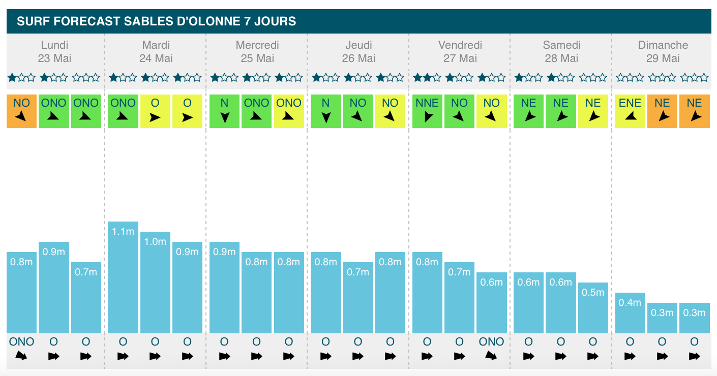 Mais la session la plus attendue, devrait bel et bien être celle de dimanche matin. En plus d'avoir de belles conditions prévues, ce sera aussi la fête des mères, l'occasion pour toutes les mamans surfeuses de se régaler à l'eau et pour cause : de jolies lignes de 1m à 1m40 avec une période de 12s et un vent qui soufflera off-shore sont attendus tout au long de la matinée.