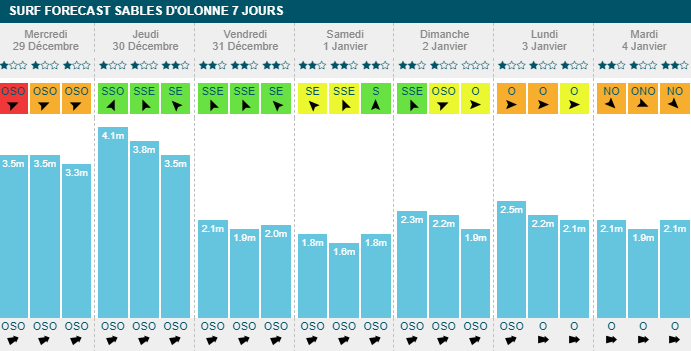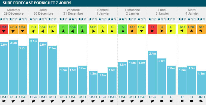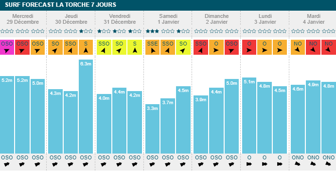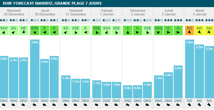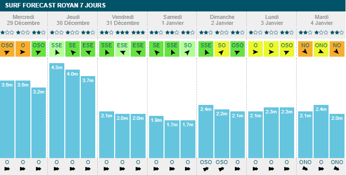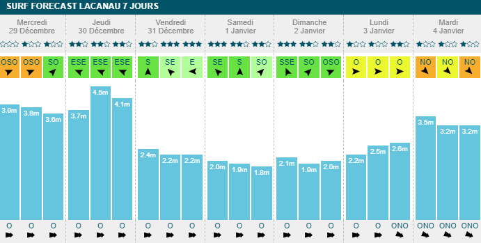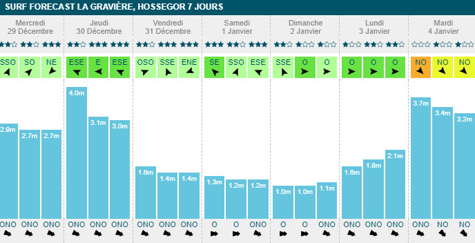 En effet, les intempéries restants suffisamment au large des côtes, les trains de houles viendront de plus loin et auront le temps de se rendre abordable, loin des 5 mètres sur les côtes comme on a pu le voir dans les semaines passées. Pour entamer cette nouvelle année, il y a juste ce qu'il faut pour profiter de la sensation de glisse, particulièrement en Gironde où les éléments semblent se synchroniser au mieux.