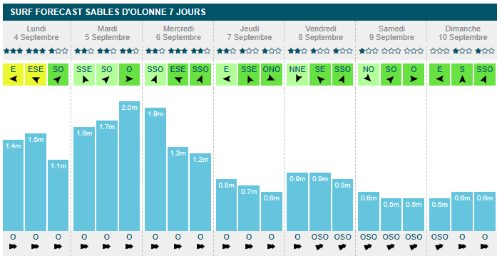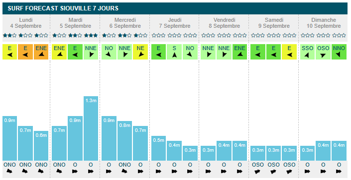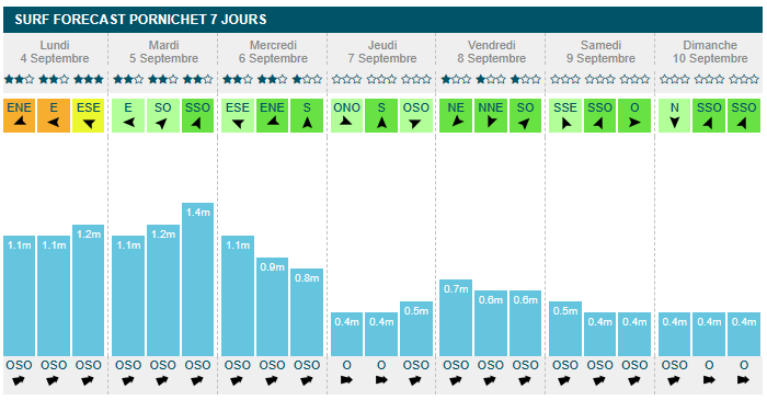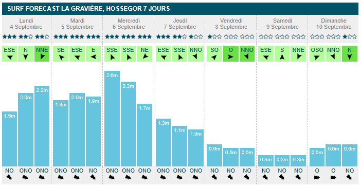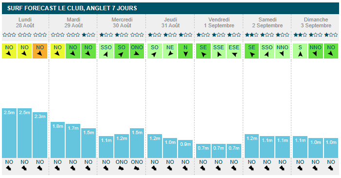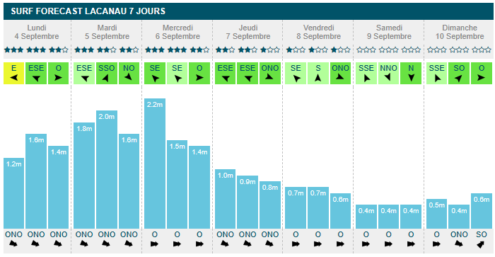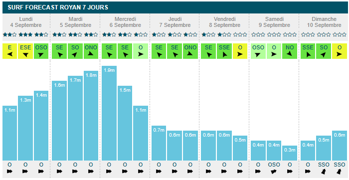 mercredi en fin de matinée (1m30, 13s, offshore à 13km/h). À partir de jeudi, la taille à l'eau passe sous les 1m, avec 70cm