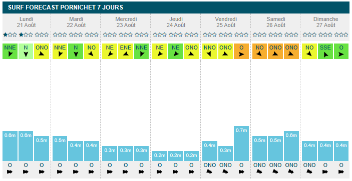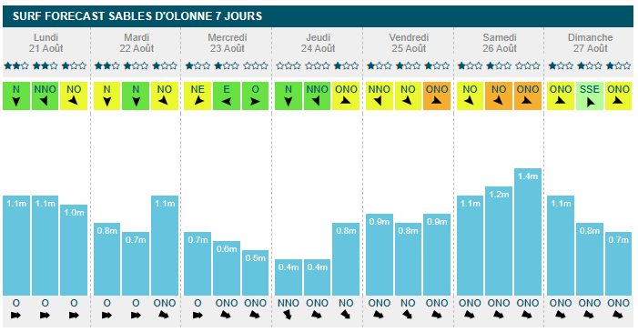 En Vendée, si la houle semble se maintenir comme la semaine passée, elle sera gênée par le vent au dessus des 20 km/h sur nombre de créneaux. Un potentiel créneau se dessine en