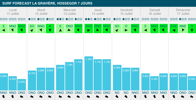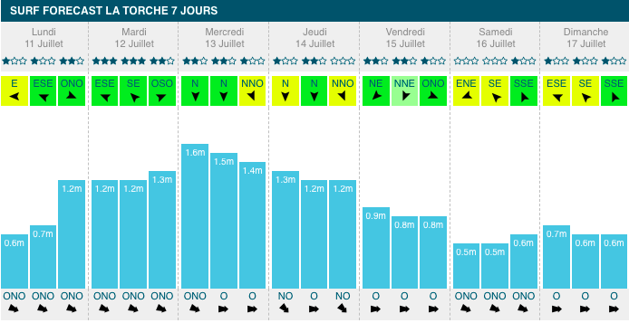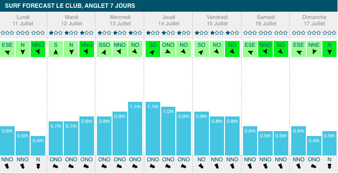 Pour les débutants, le mercredi matin devrait être particulièrement intéressant. Il est prévu 60cm à 90cm, pour une période de 10s et un doux vent du sur de 8km/h.
