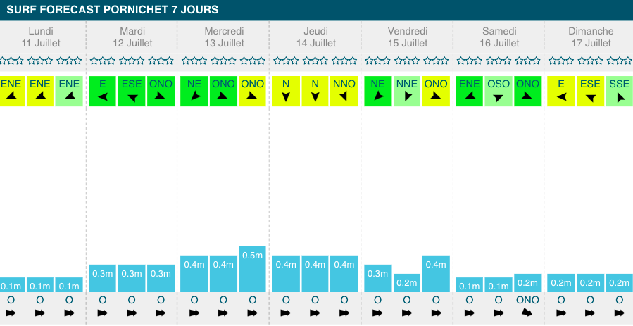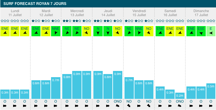 Un peu plus de créneaux pour la Charente-Maritime en comparaison aux départements plus au Nord ! Une mise à l'eau peut être envisagée le mercredi matin avec de petites vagues de 80cm et une période de 12s et un vent nord-est à 16km/h (proche de l'offshore).