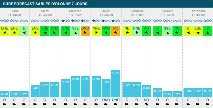 La Vendée n'est pas plus gâtée que la Loire-Atlantique cette semaine, la houle se faisant désirer. Un mini-créneau potentiel se dessine le mercredi en fin de matinée : 70cm de vagues, 12s de période et un vent off-shore de 10km/h, de petites conditions pour les débutants et ceux qui recherchent juste un petit plaisir de glisse.
