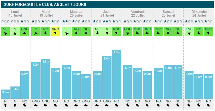 Le Pays basque bénéficie comme les Landes d'une période qui se maintient légèrement en milieu de semaine ainsi que de vents moins forts (et donc gênants pour les plans d'eau). Ça surfe mardi en début d'après-midi : 90cm à 1m40 à la série, 12s de période, vent sideshore (Nord Nord Ouest) à 16 km/h.