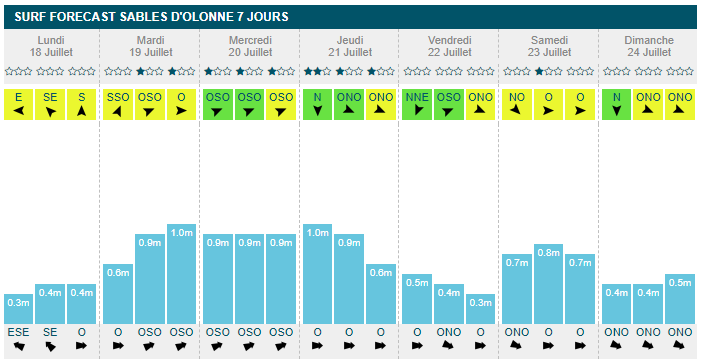 Légèrement plus gâté que ses voisins du Nord, le département des Landes devrait connaître du petit surf dès mercredi matin : 1m à la série, 10s de période et un vent de Sud Sud Est à seulement 5km/h.