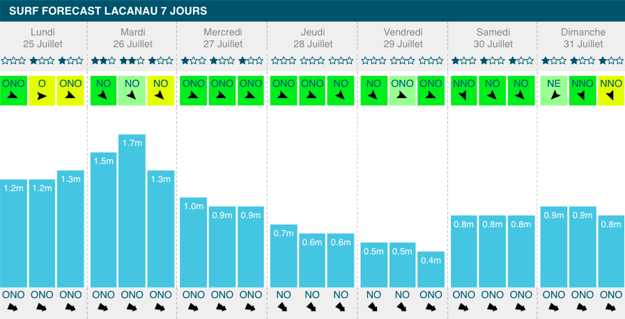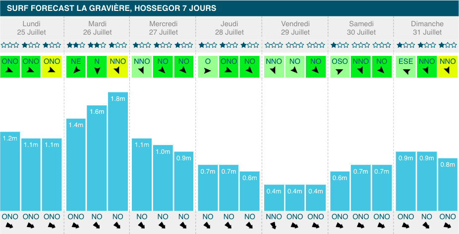 Des vagues allant jusqu'à 1m70 à la série sont prévues pour le mardi matin avec une période de 10s et un faible vent cross-shore orienté Nord-Ouest. Avec moins d'intensité la journée de mercredi se démarque tout de même avec une houle de 1m et 9s de période. Attention toutefois au vent on-shore qui tournera autour des15km/h.