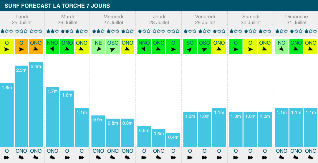 Toutefois un créneau semble sortir du lot, mardi matin à 8h : des vagues de 70cm à 1m sont prévues accompagnées d'une période de 10s et d'un vent cross-shore de 13km/h. C'est le moment à ne pas rater si vous voulez vous mettre à l'eau cette semaine.