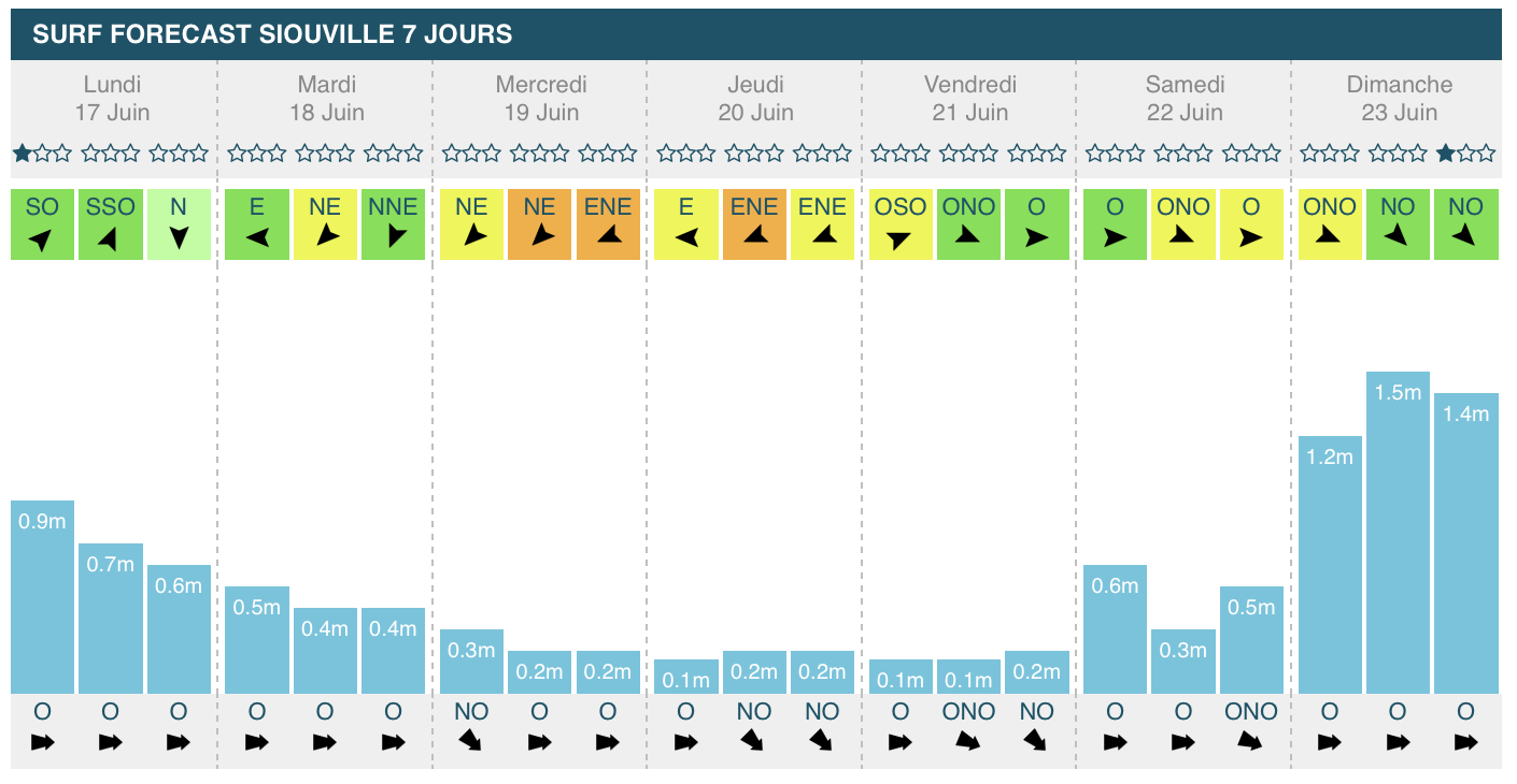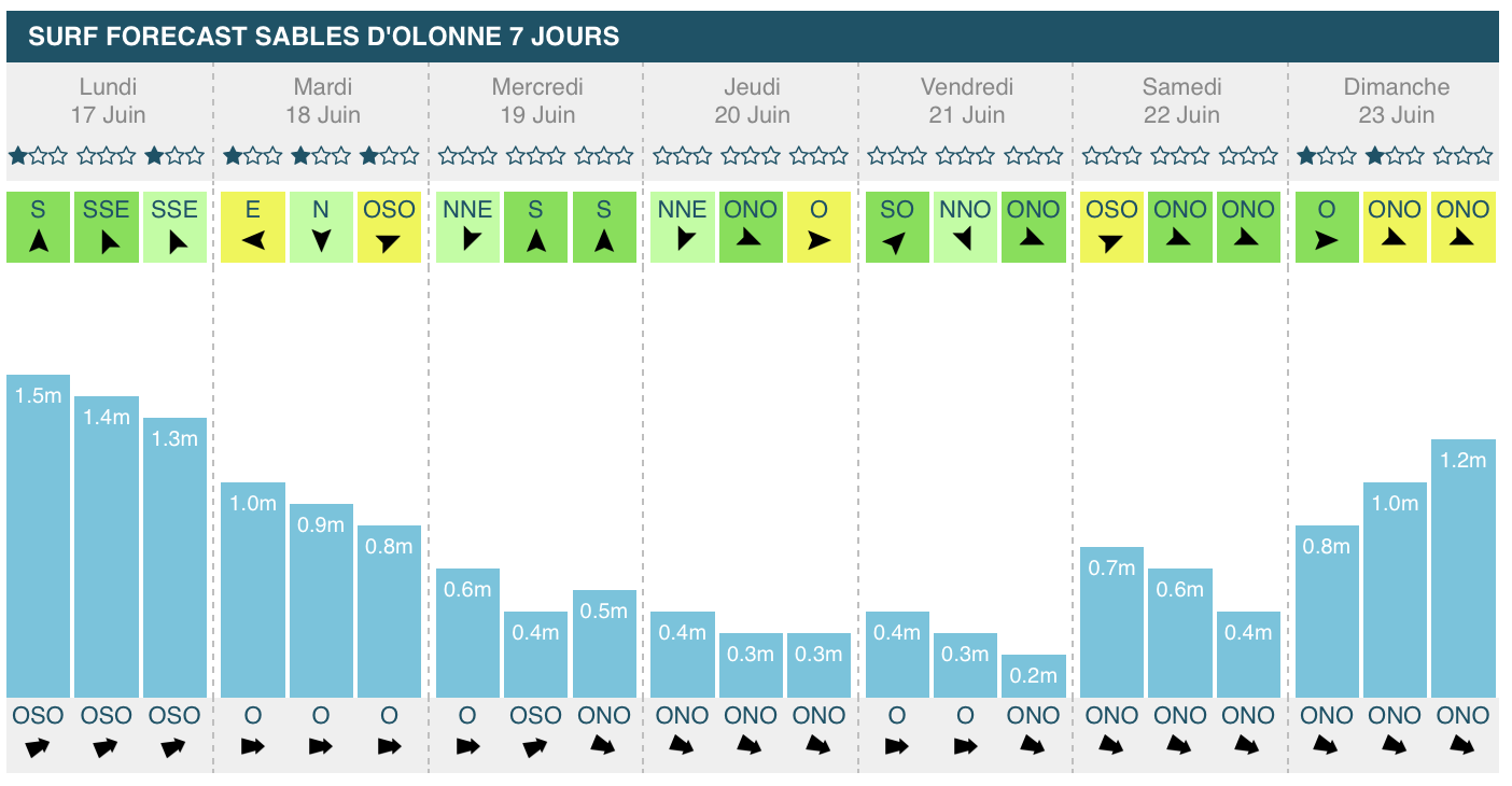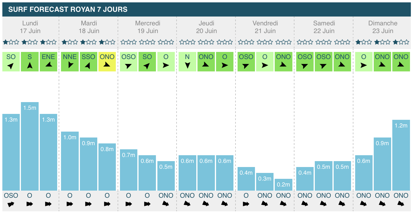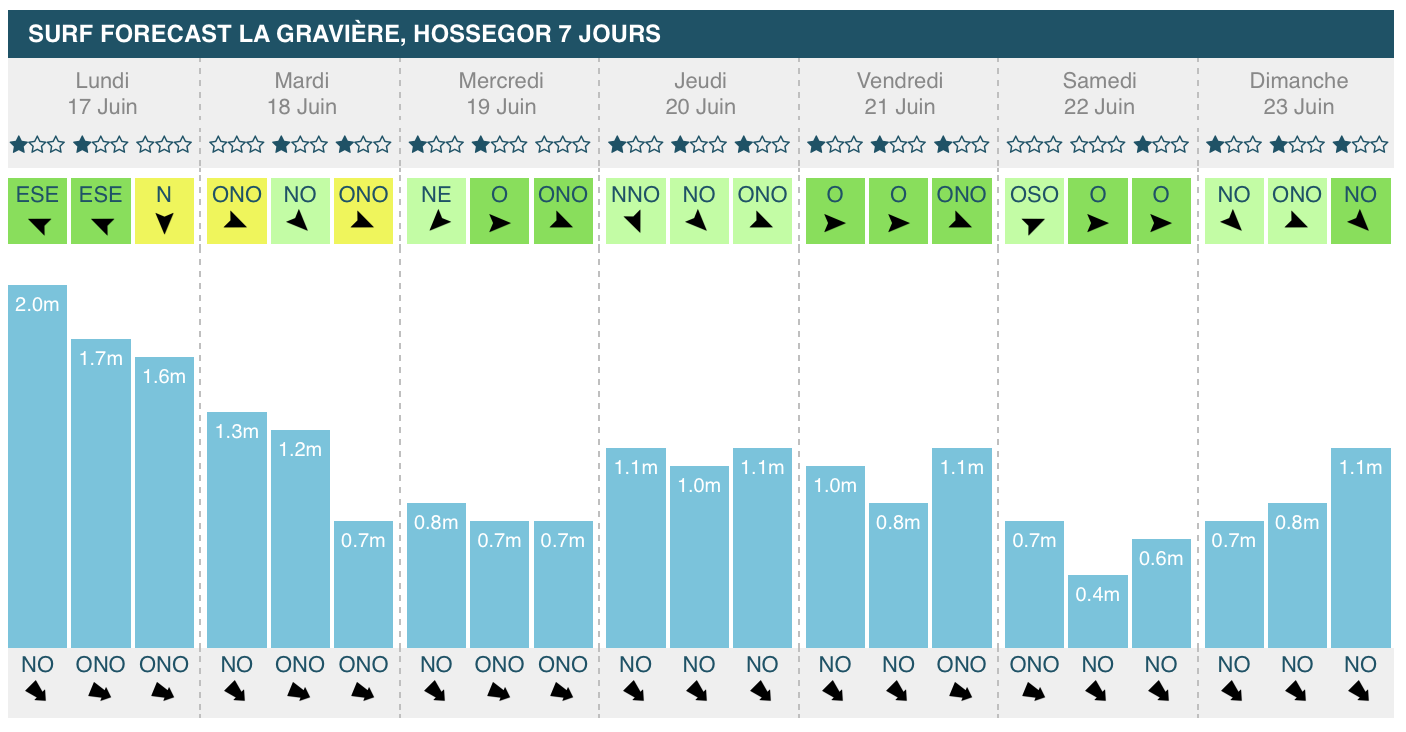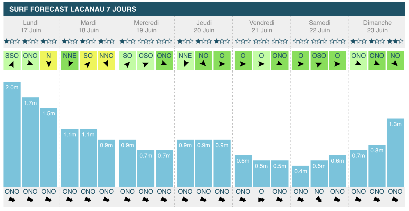 Ça surfe dans les Landes pour lancer l'été ! La taille observée ce week-end se maintient ce lundi avant de tomber peu à peu. La journée de mardi pourrait être gênée par le vent, changeant et souvent au-dessus des 20km/h. En suivant, la journée de mercredi se dessine avec un certain potentiel, accessible à tous. La houle se maintient avec des séries attendues à 1m10 sur la journée, pour des vagues cependant plutôt molles (6s). Bien que onshore, le vent sous les 10km/h ne devrait pas être une barrière. La période chutant encore les jours suivants, c'est dimanche qu'on espère voir de plus belles sessions, notamment en fin de journée avec une nouvelle entrée de houle : 1m20, 9s.