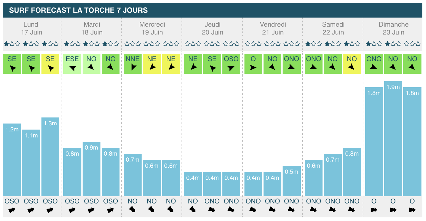 Ça surfe cette semaine en Bretagne ! Un peu de taille en début et fin de semaine et des conditions estivales abordables pour tous entre les deux. Si les journées de mercredi à vendredi pourraient manquer de houle (moins de 50cm attendus et période basse de 6s), une session facile pourrait se profiler mardi matin : 80cm, 6s (faible) mais un vent offshore idéal à 6km/h. Pour plus de taille, vous pourrez miser sur lundi (1m30) mais surtout sur la journée de dimanche. Pour clotûrer la semaine, une belle entrée de houle (1m50) devrait produire des vagues jusqu'à 1m80 à la série. Attention tout de même au vent, onshore, qui devrait forcer dans l'après-midi et fortement gêner les sessions.