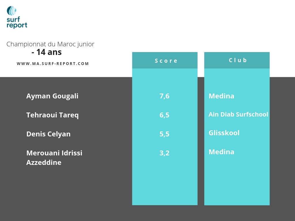 les finales des championnats du Maroc Juniors de surf se sont déroulé le weekend du 20 et 21 Septembre le sur le spot d'Ain Diab. La météo particulièrement favorable a séduit les familles, venues nombreuses en cette rentrée scolaire, accompagnant les jeunes sportifs. Localisé au CasaSurfhouse, les finales juniors ont connu La catégorie de moins de 14 ans a connu la participation de plusieurs jeunes surfeurs venu de différents club du royaume. Le jeune surfeur de 12 ans issus du club Medina et coaché par Abdelkhalek El Harim a remporté le titre de champion du Maroc en - 14 ans. Le surfeur Rbati s'est imposé tout au long de la compétition pour arriver à la finale qui la dispute contre Denis Celyan (Glisskool), Tehraoui Tareq(Ain Diab Surfschool) Merouani Idrissi Azzeddine( Medina). Ayman Gougali réussi a remporté la finale grâce à un total de 7.6 points issus d'un combo de 4 et 3.6 points et remporte pour la première fois les championnats du Maroc. Ce résultat donnera surement à Ayman plus de confiance lors des prochaines compétitions.