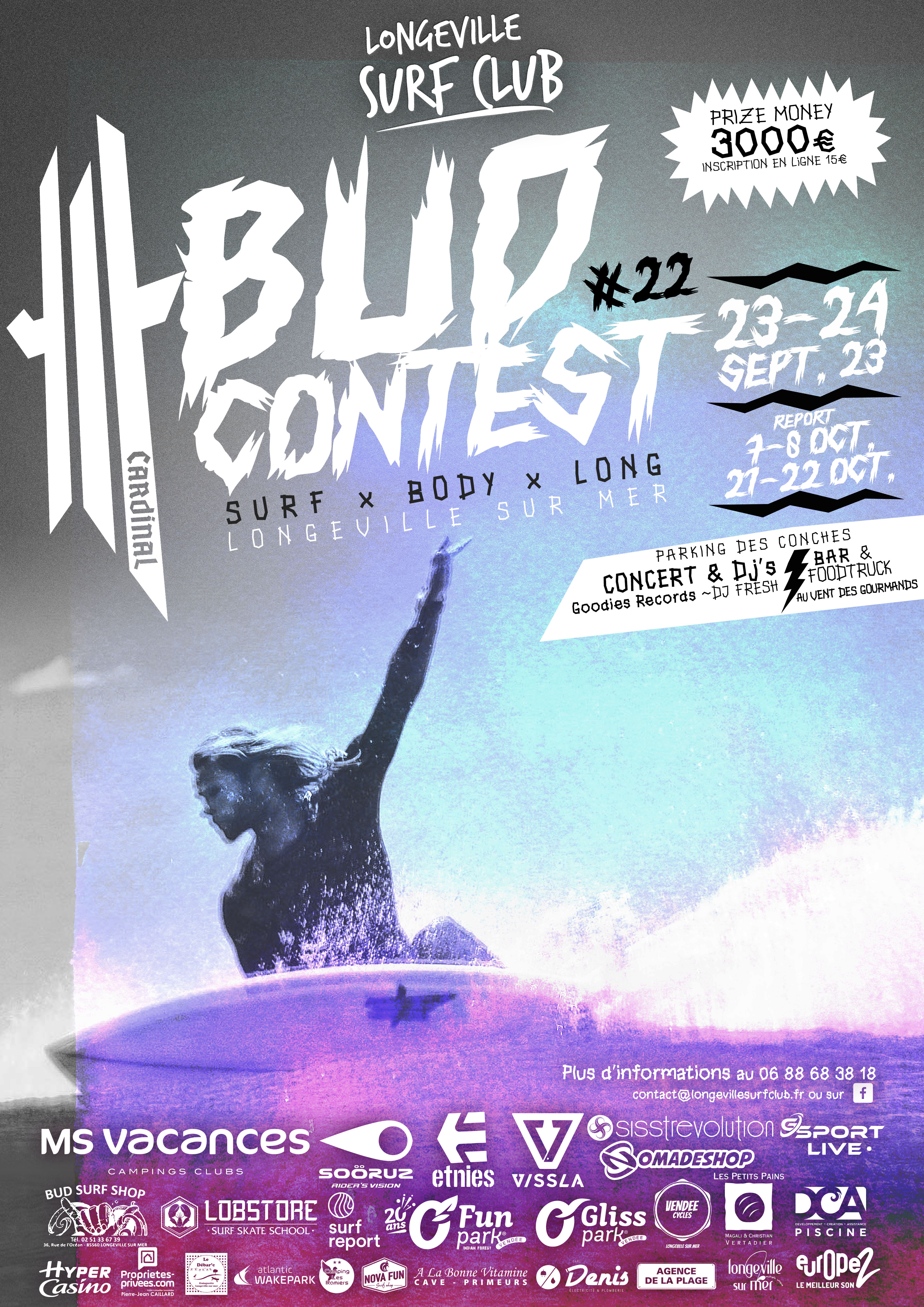 Les 23 et 24 septembre, le beachbreak de Bud Bud (Longeville-Sur-Mer, Vendée) accueillera des compétiteurs en surf, bodyboard et longboard, pour les moins de 18 ans dès samedi 8h30, pour les catégories open dès dimanche 8h30. Le dimanche, l'événement connaitra aussi une belle nouveauté, un live vidéo avec G SPORT LIVE et EYE CLIPS PRODUCTION. Côté prize money, ce sont 7000€ de lots fournis par les partenaires de l'événement à remporter pour les catégories espoirs et un prize money de 3000€ en jeu chez les open.