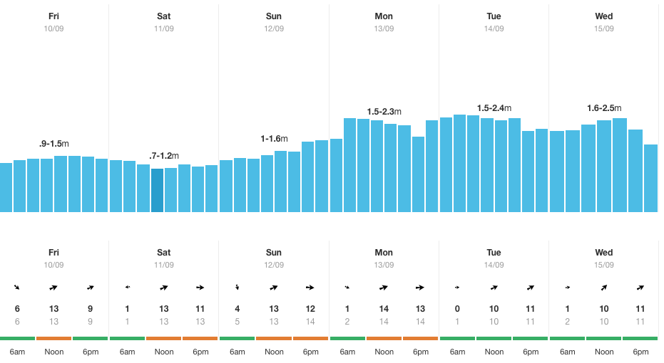 En cause, des houles de plus d'un mètre et des périodes de 20 secondes en moyenne, de quoi assurer une belle puissance venue de l'océan. Côté vent, un léger crosshore est annoncé, rendant peu probable des conditions glassy mais n'empêchant pas pour autant de jolies formations à l'eau. Selon les prévisions, si ce dernier semble se lever dans l'après-midi de lundi, il reste pour l'instant minime sur la grande majorité des journées de mardi 14 et mercredi 15.