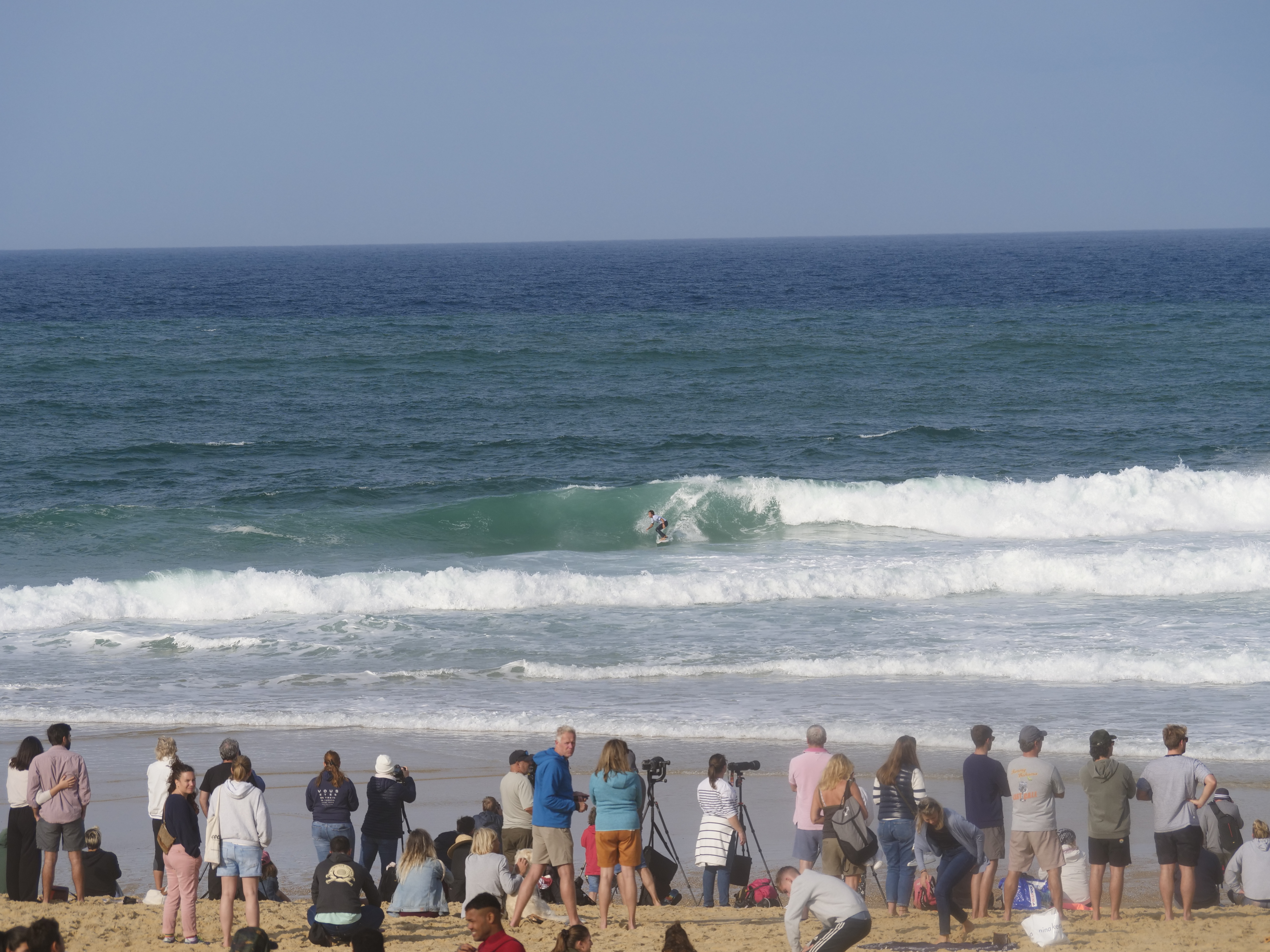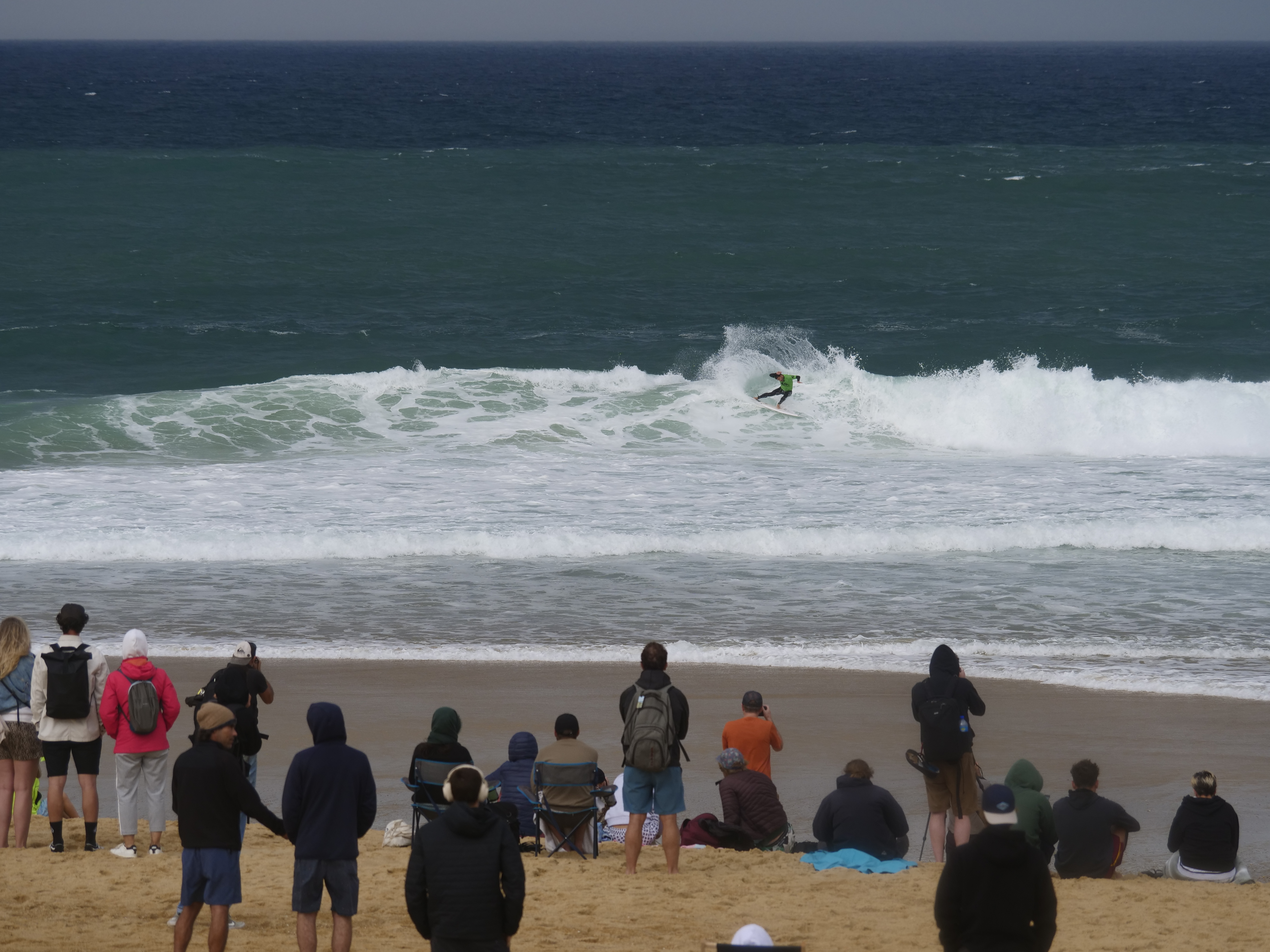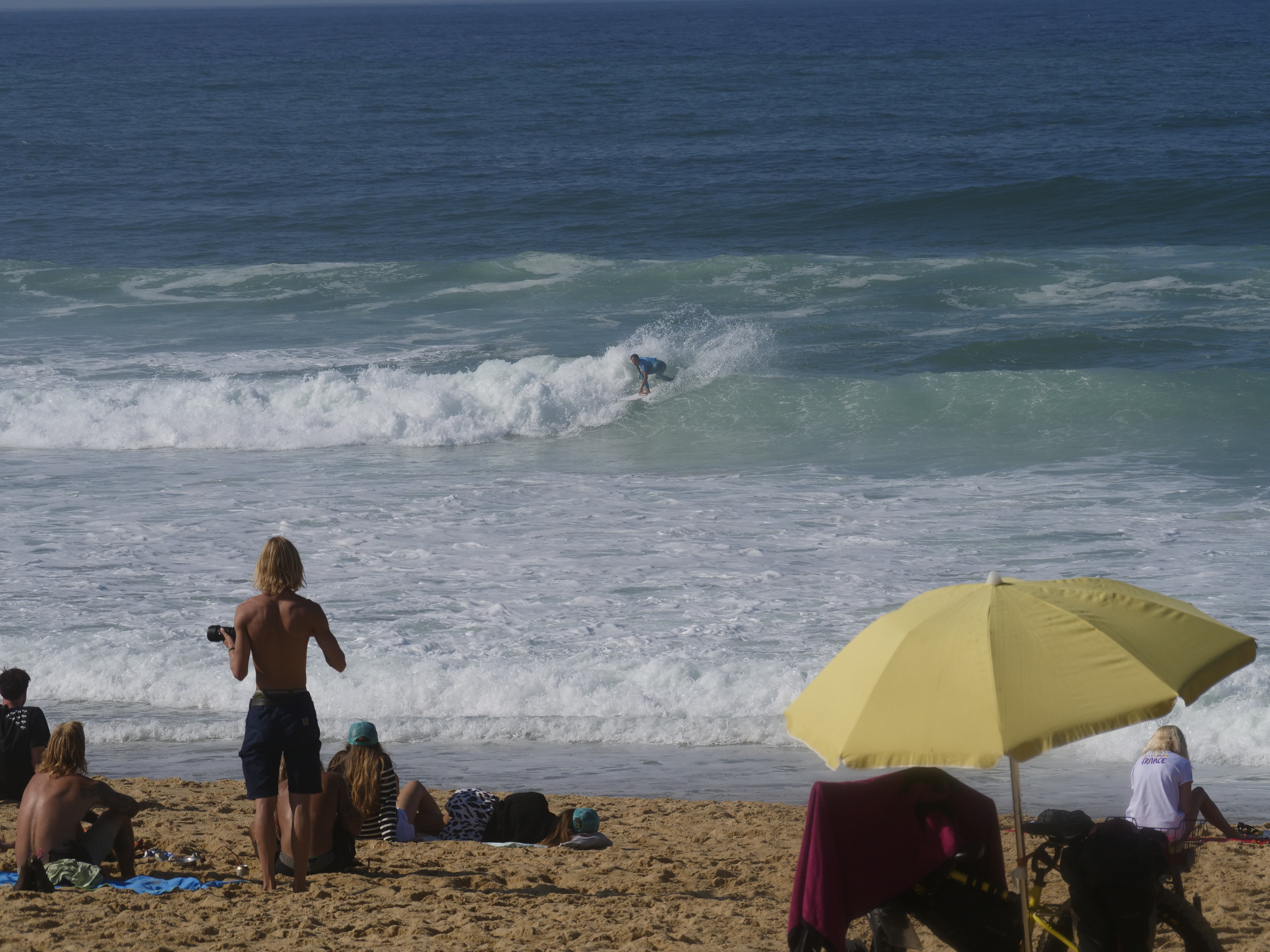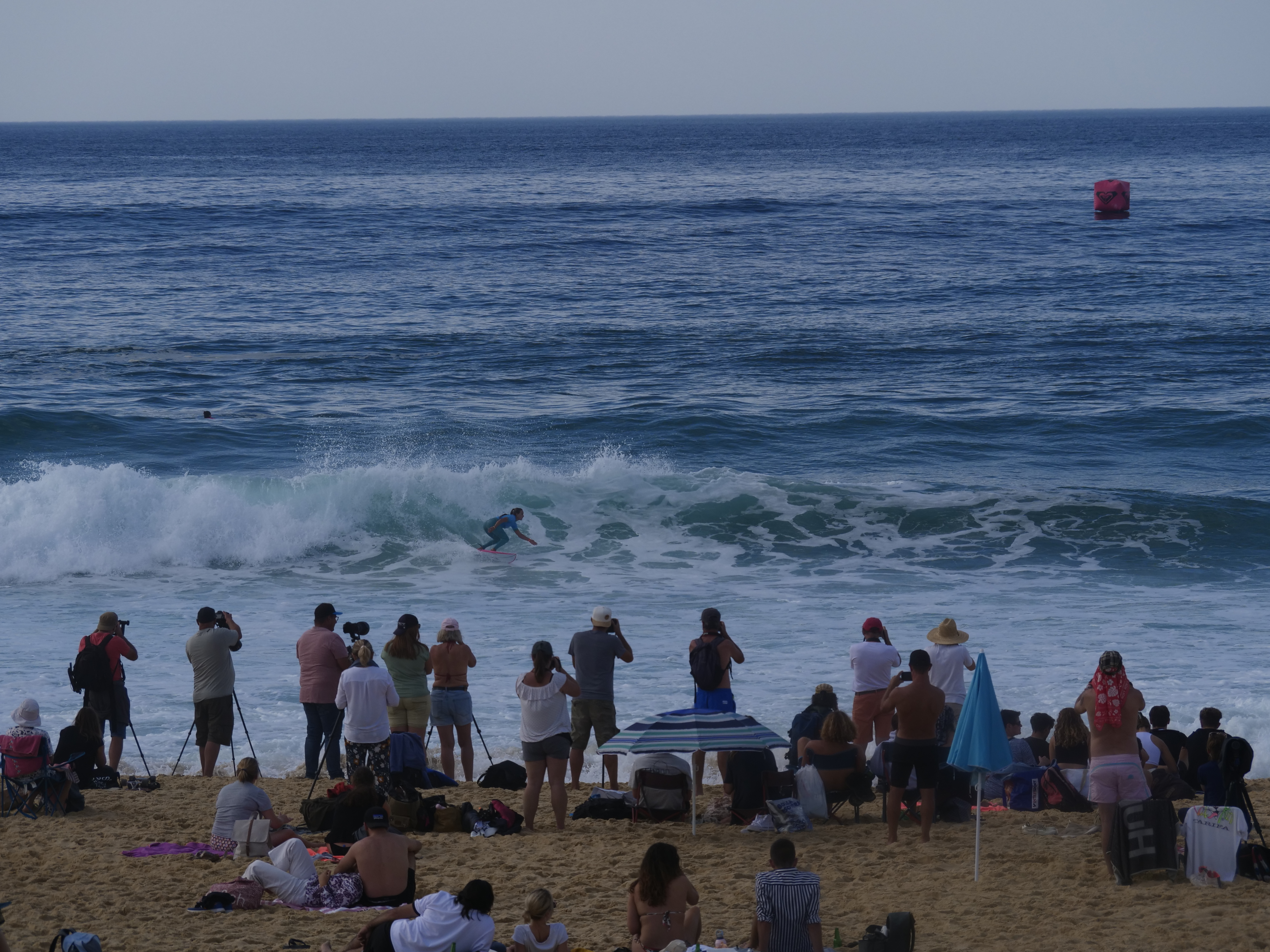 12h : c'est la fin du round of 96 et le lancement du Roxy Pro (round of 32), toujours en double banks. On y voit plus clair depuis la plage, mais les surfeuses peinent à trouver les scores : dans les heats 1 et 2, seules trois surfeuses sur les huit à l'eau parviennent à trouver une vague à plus de 5 points.
