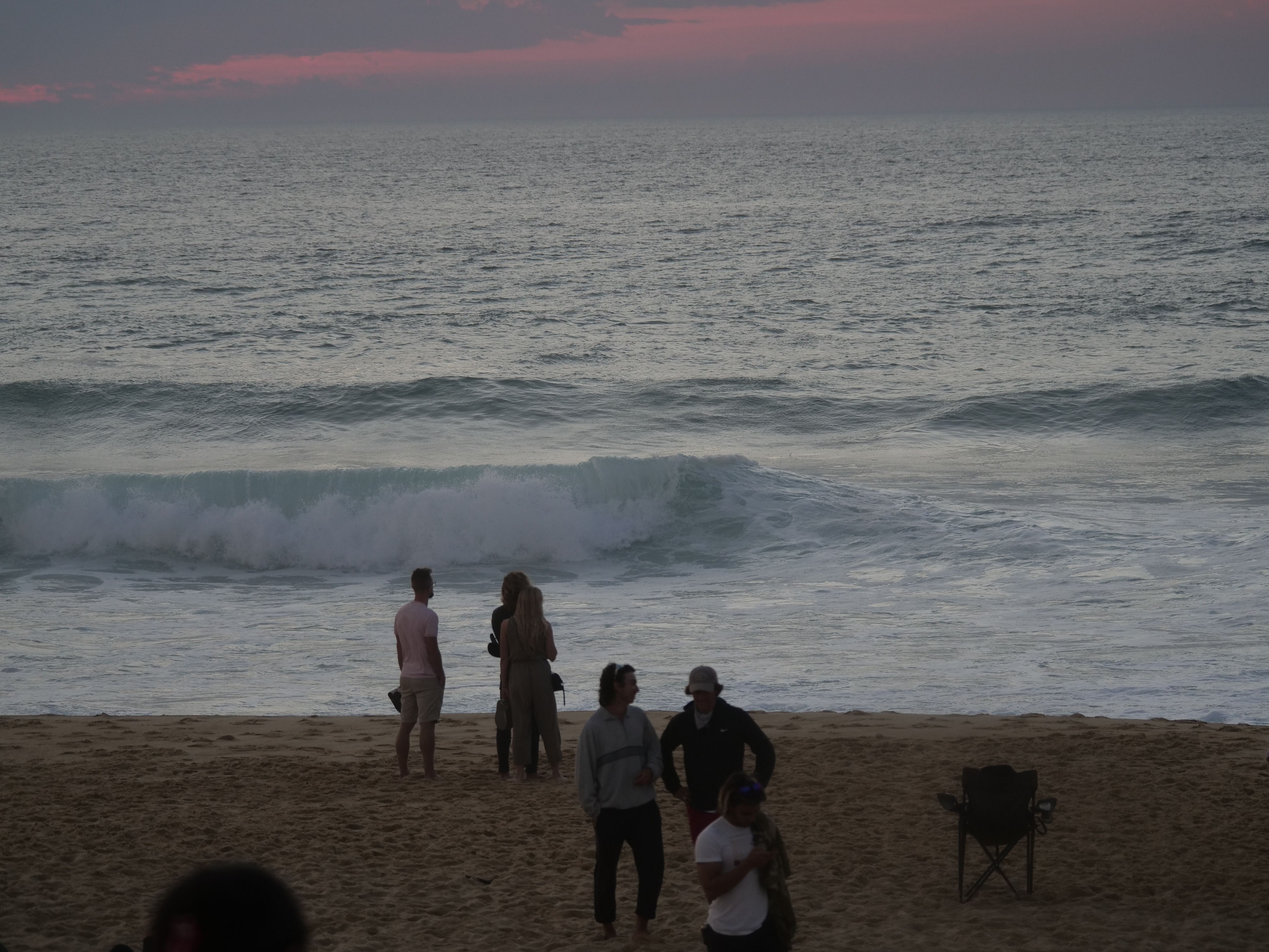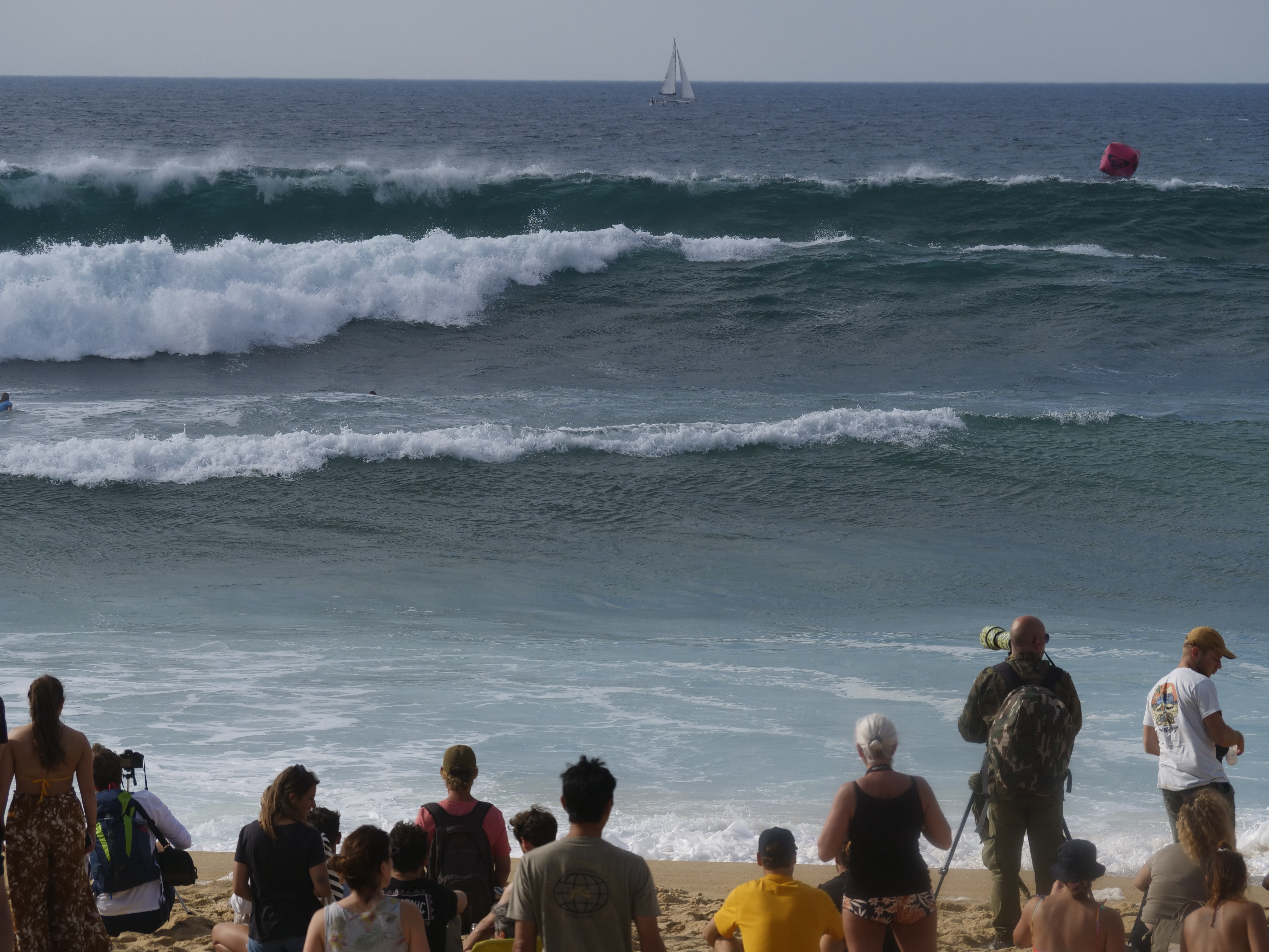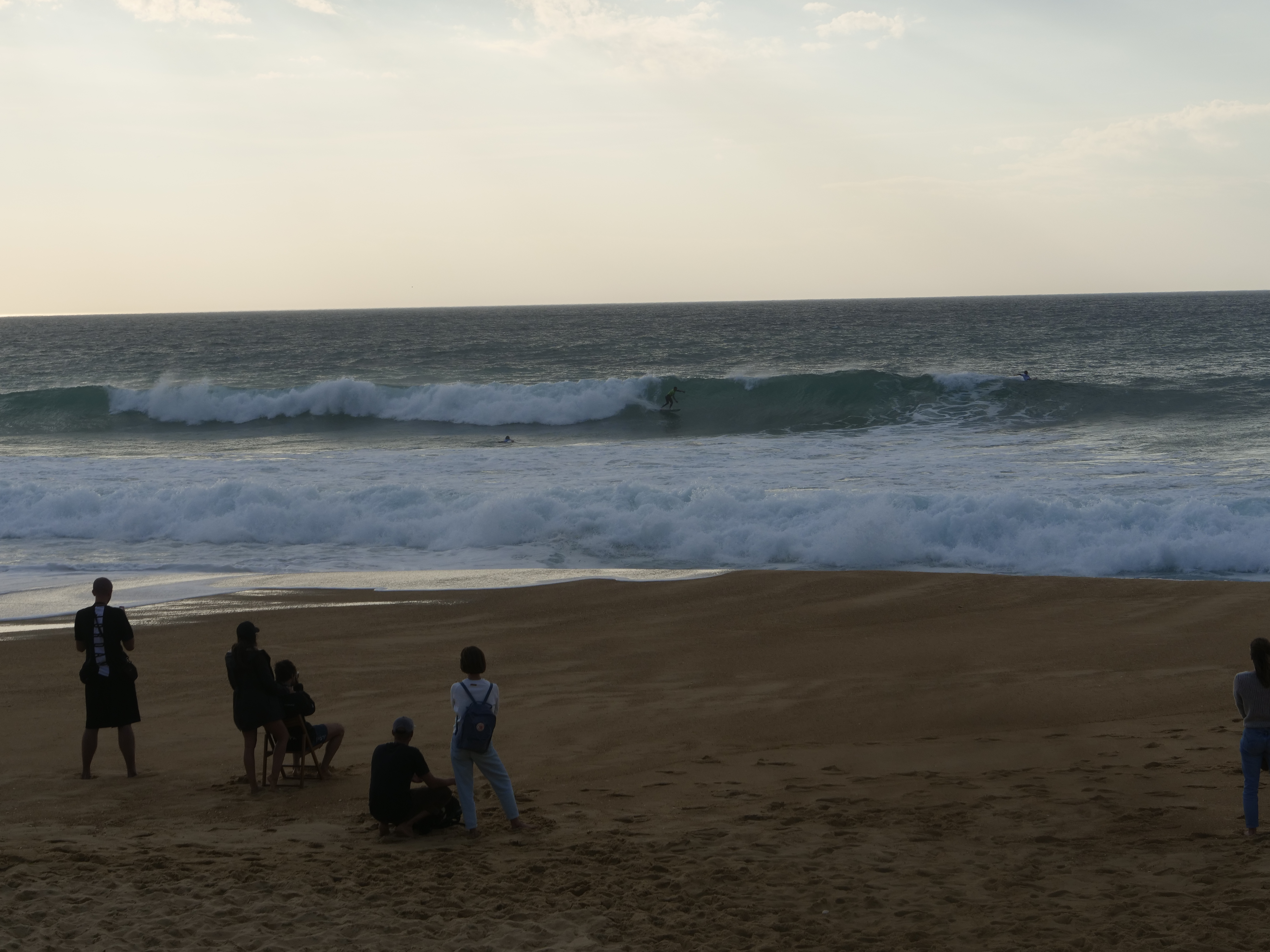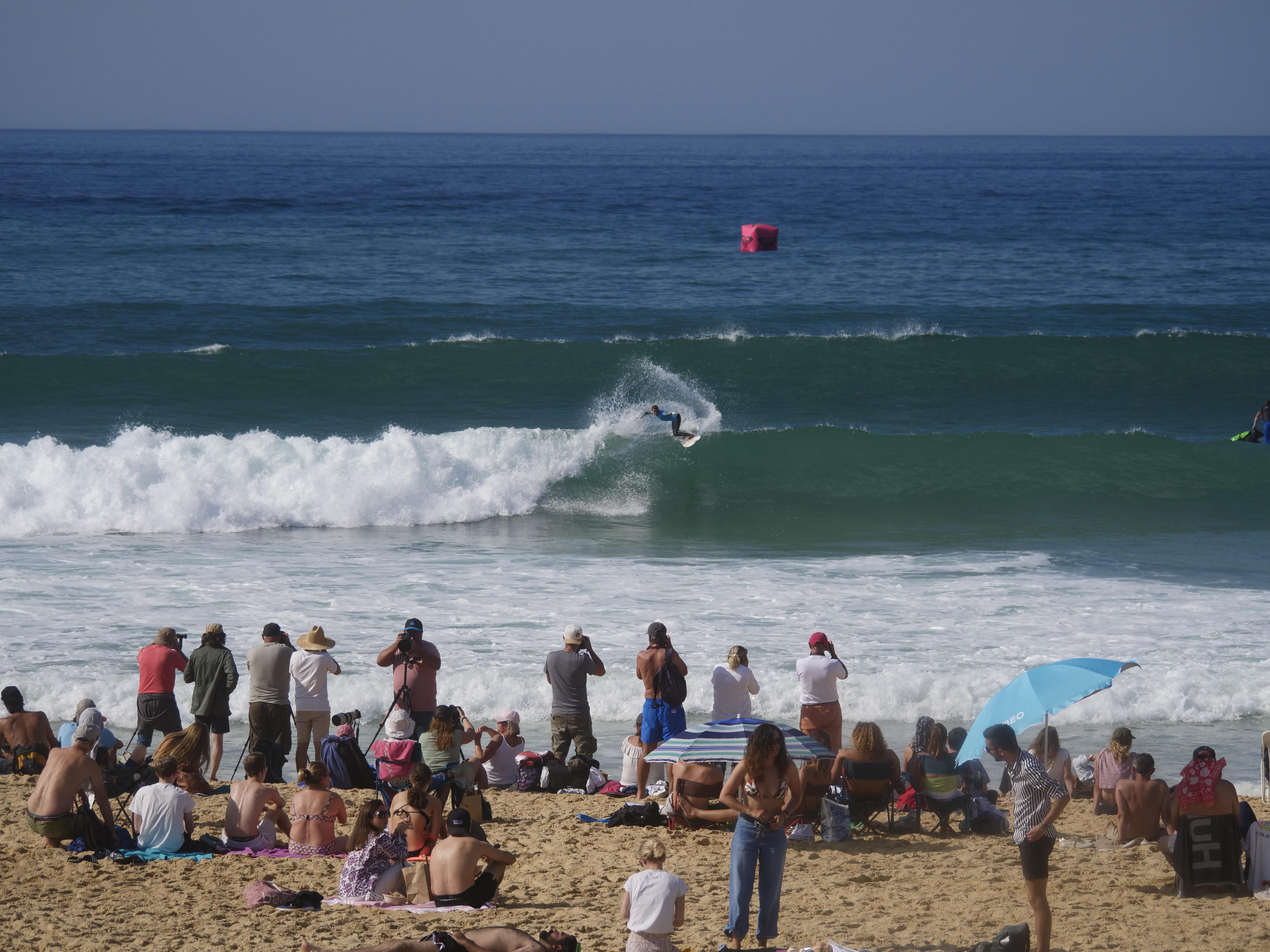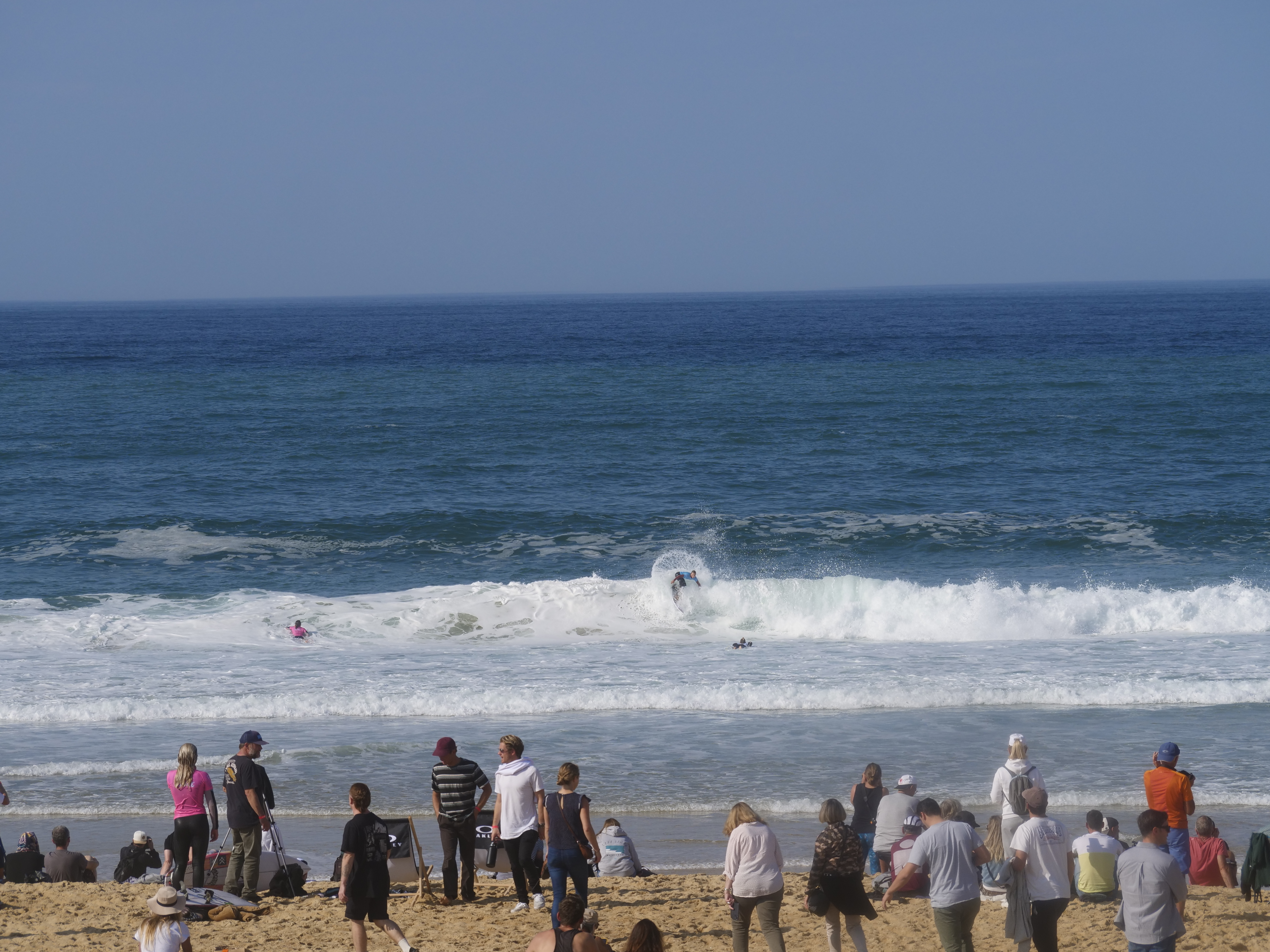 12h : c'est la fin du round of 96 et le lancement du Roxy Pro (round of 32), toujours en double banks. On y voit plus clair depuis la plage, mais les surfeuses peinent à trouver les scores : dans les heats 1 et 2, seules trois surfeuses sur les huit à l'eau parviennent à trouver une vague à plus de 5 points.