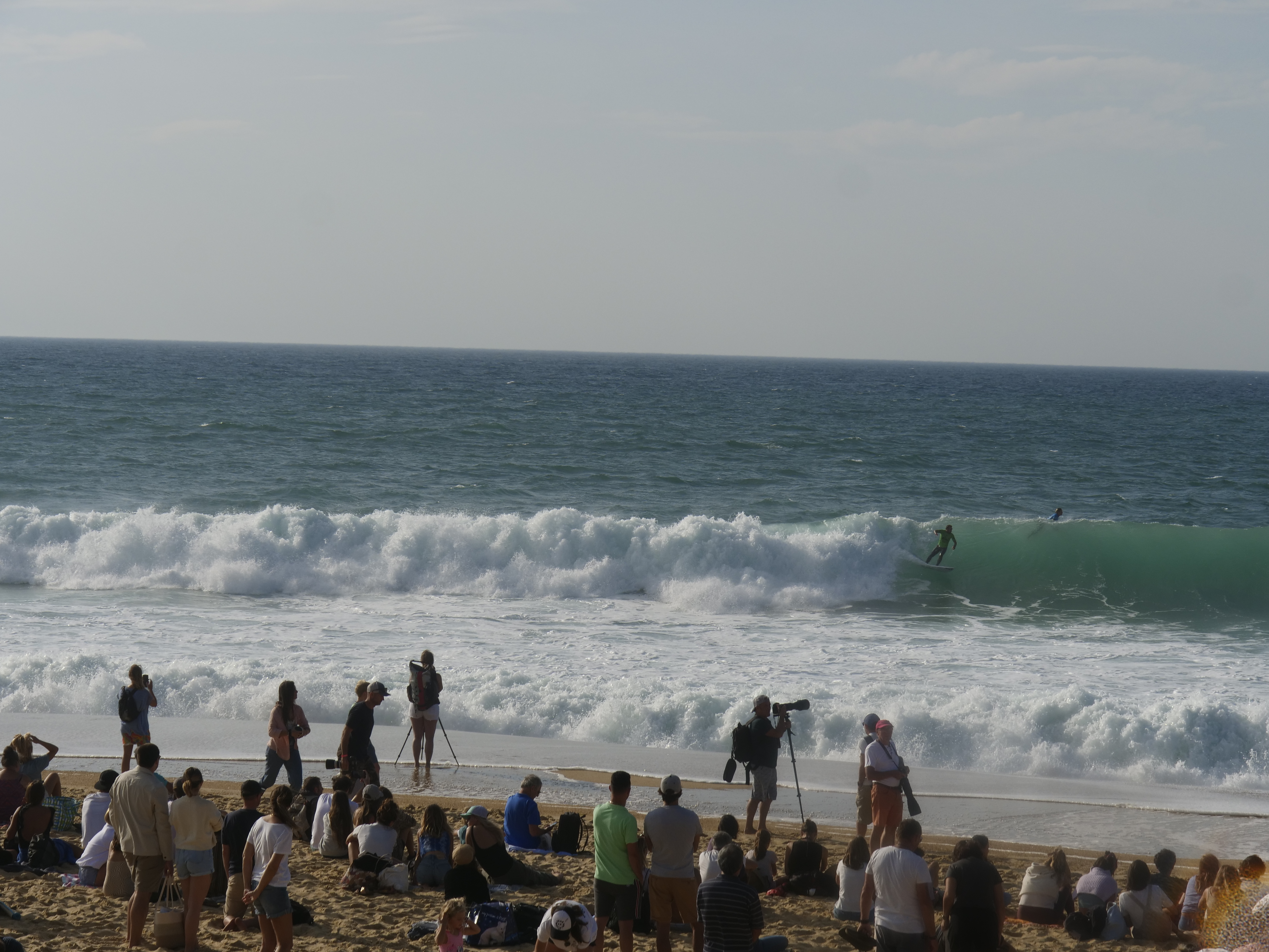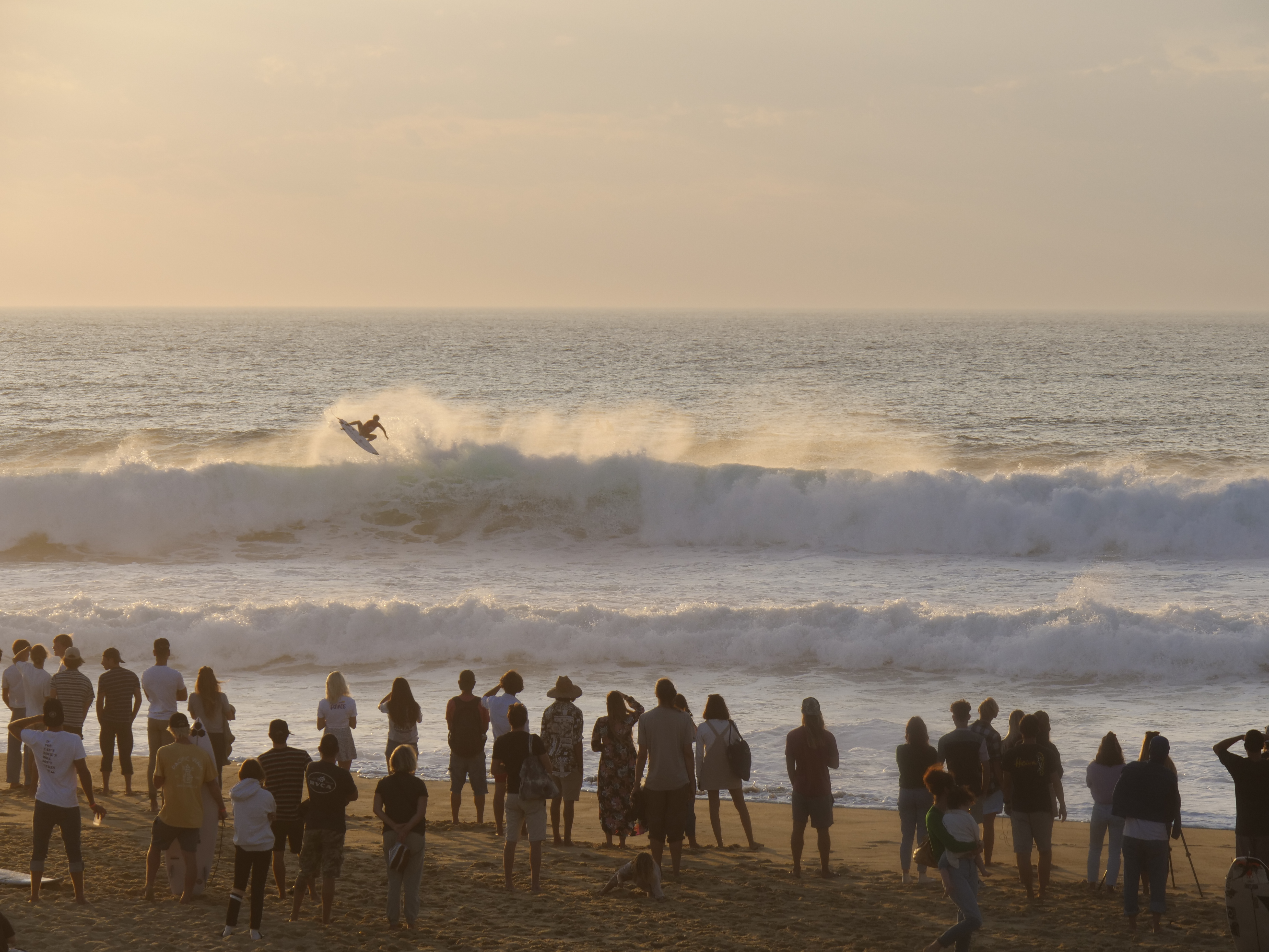 À marée haute (17h28), la vague du shorebreak repousse le public plus haut sur la plage. On voit quelques opportunités d'aerials sur le banc sud et quelques droites, même si la gauche reste favorite. Le peak semble s'être déplacé légèrement plus au sud alors que les vagues continuent de prendre de la taille, avec une houle de 1m50 qui pousse des séries jusqu'à près de 1m80.
