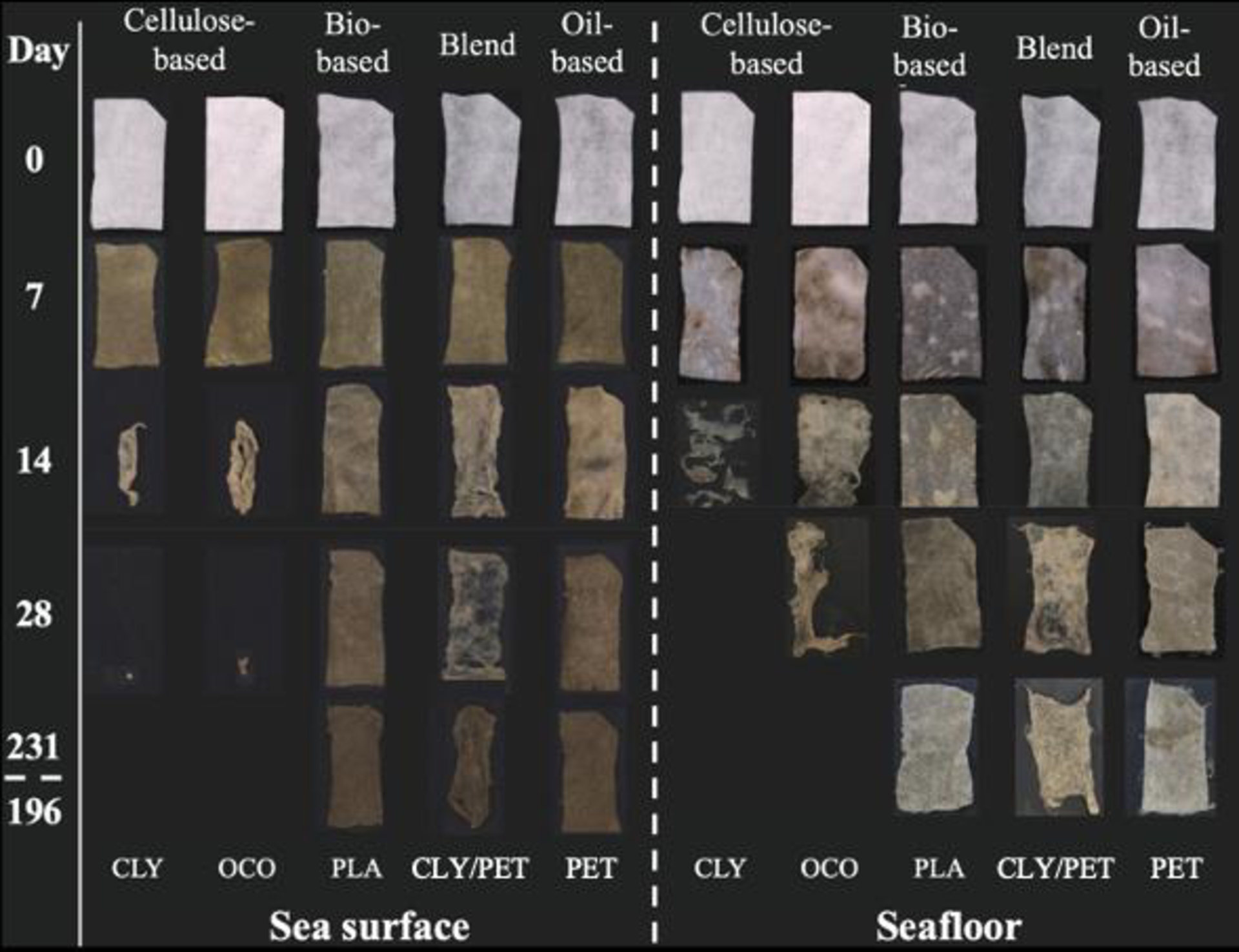 Sarah-Jeanne Royer, océanographe à The Ocean Cleanup, chercheuse à l'institut d'océanographie Scripps à San Diego en Californie et à l'Université Hawaï Pacific, travaillait en collaboration avec Francesco Greco, Michaela Kogler et Dimitri D. Deheyn. Les résultats qu'ils ont obtenu à l'issue de leurs recherches révèlent qu'en usant des appellations "biodégradables", "biosourcés" et "compostables", les industriels manipulaient les consommateurs. Pour pouvoir affirmer une telle chose, les scientifiques ont plongé quatre types de plastiques différents dans deux milieux distincts : de l'eau de mer et un bioréacteur. Le premier type de plastique est constitué de matériaux 100% naturels appelé cellulose, le second est fait de polyester et polypropylène issus de la pétrochimie (oil-based dans le tableau ci-dessous), le troisième est un mix des deux (blend) et pour finir nous retrouvons le fameux PLA, constitué de textiles à base d'acide poly-lactique.