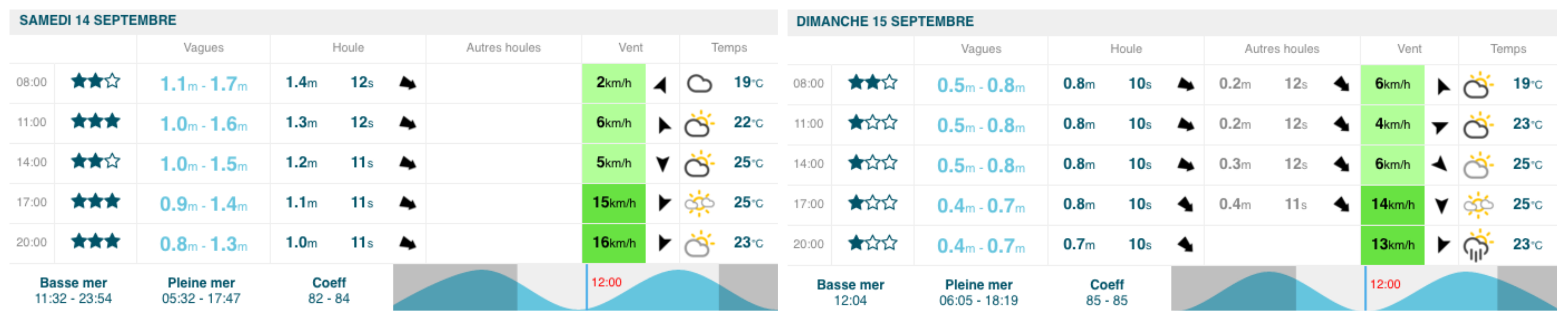 En effet, on annonce une jolie houle d'ouest peu dérangée par un faible vent défavorable, censé amener des vagues atteignant 1,5m à la série et façonnées par une belle période (11s à 12s). Le samedi et dimanche matin, ce sera propre !