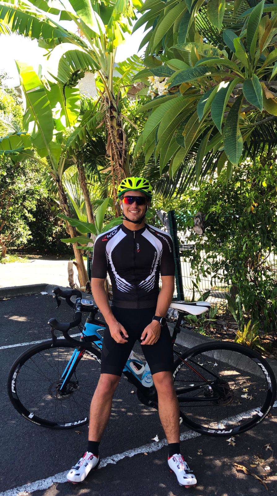 Il y a cinq ans, son grand-père lui a transmis sa passion et depuis, le surfeur réunionnais est un fou de petite reine. Dès que son emploi du temps le lui permet et que l'océan lui laisse un peu de répit, le vice champion d'Europe Junior 2018 enfourche son vélo et part à la conquête des routes de sa région d'adoption.