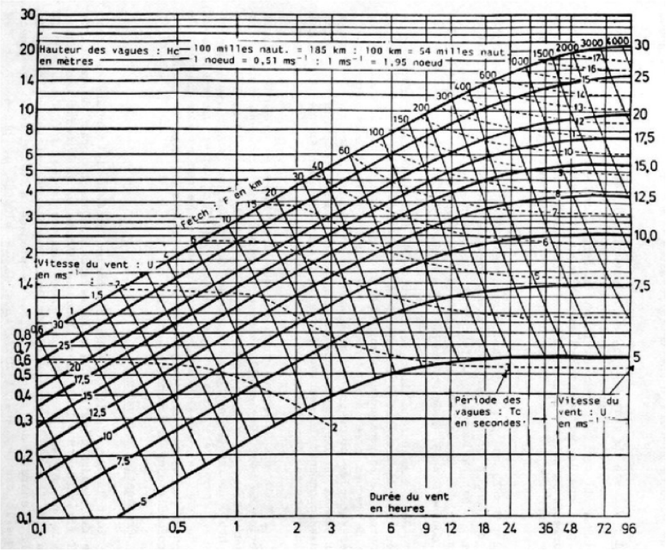 En chiffre : Pour donner un exemple concret, un vent soufflant à 50 noeuds sur 100km créera une houle de 8s. Alors que si ce même vent souffle sur 1000km, la période de la houle créée sera de 13s.