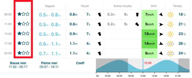 Les étoiles sont mises en place pour faciliter la lecture des prévisions et aller à l'essentiel. En prenant en compte l'ensemble des éléments présentés plus haut, la qualité du surf y est notée sur trois étoiles (sur le jour est la période donnée) : plus il y a d'étoiles colorées, meilleur est le surf.