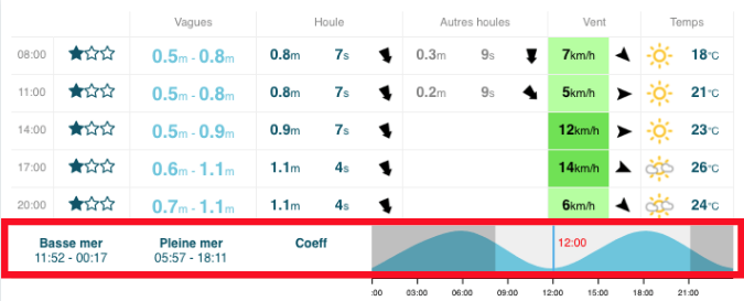 De plus, il est important de ne pas faire l'impasse sur le coefficient lorsque l'on regarde les marées. C'est un indicateur qui permet de savoir si la marée à un gros ou petit marnage. Ce dernier correspond à la différence entre la hauteur de la basse mer et la hauteur de la pleine mer. Il s'agit de l'amplitude de la marée, et il donne donc des indications sur le volume d'eau déplacé sur une zone donnée. Un coefficient de marée varie entre 20 et 120. Le coefficient idéal pour le surf, lui, oscille généralement entre 50 et 70.