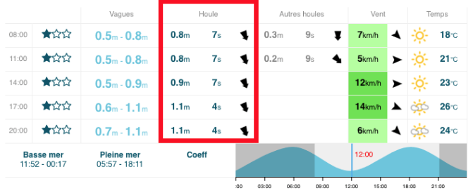 Deux critères sont ainsi important pour lire la houle : la taille indiquée - notée en mètres (m), et la période - notée elle en secondes (s).