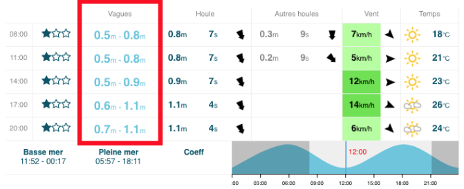 Il ne faut pas confondre la taille de la houle et la taille des vagues ! Lorsqu'une houle de 1m est annoncée, il s'agit de la taille de l'ondulation, et non de la taille réelle de la vague. Ce sont les facteurs tels que le vent et les caractéristiques du spot qui seront ensuite à l'origine des dissimilitudes de tailles des vagues entre spots. Bien que les conditions annoncées soient les mêmes sur certaines zones, les spots eux, réagiront différemment. Cela explique d'ailleurs pourquoi certains pics fonctionnent et d'autres beaucoup moins, et ce sur une même journée.