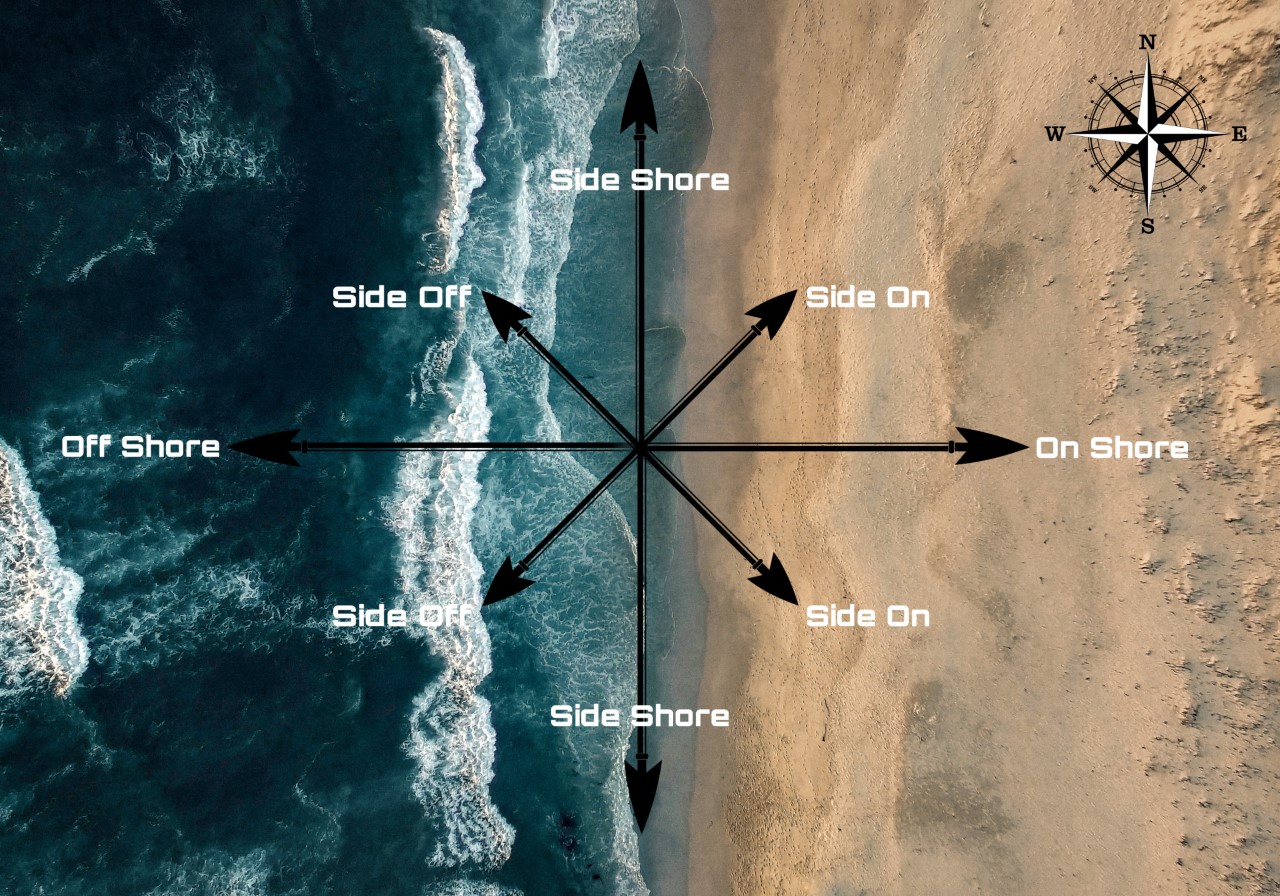 - side-shore : le terme est utilisé quand le vent tourne et qu'il souffle le long de la côte, parallèlement à la plage. Dans ce cas de figure, s'il est plutôt puissant, le plan d'eau est agité et des courants sont générés dans l'eau, au plus grand regret des surfeurs.