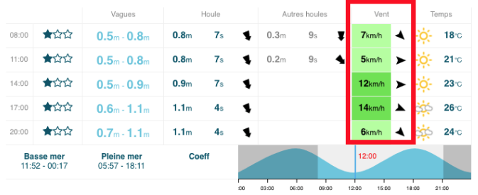 À noter : sur la côte ouest française, lorsque les températures se réchauffent, le vent change généralement d'orientation entre la fin de matinée et le début d'après-midi, du fait notamment des conditions dites anticycloniques. Ce phénomène est dû aux différences thermiques qui s'exercent au fur et à mesure que le soleil réchauffe la terre. Le plan d'eau se dégrade alors souvent, car le vent est généralement off-shore le matin (l'océan est plus chaud que la Terre et attire le vent vers lui) et tourne on-shore en milieu de journée (la Terre devient plus chaude que l'océan, ce qui inverse la direction du vent). Notamment une raison pour laquelle les surfeurs sont des lève-tôt !