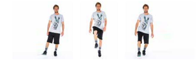 Mouvement. Exercice identique au précédent mais en gardant un appui permanent sur l'orteil. La jambe libre bascule vers l'arrière.