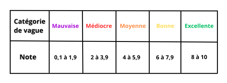 Mais avant même de donner une note, les juges raisonnent en catégorie de vague. Une manière de coordonner le jugement entre les juges et ainsi d'éviter les gros écarts entre les notes. « Quand la vague est terminée, avant de penser en note on va penser en catégorie de vague. On va se dire ok, cette vague, c'est une vague moyenne, elle sera entre 4 points et 5,9 points. »