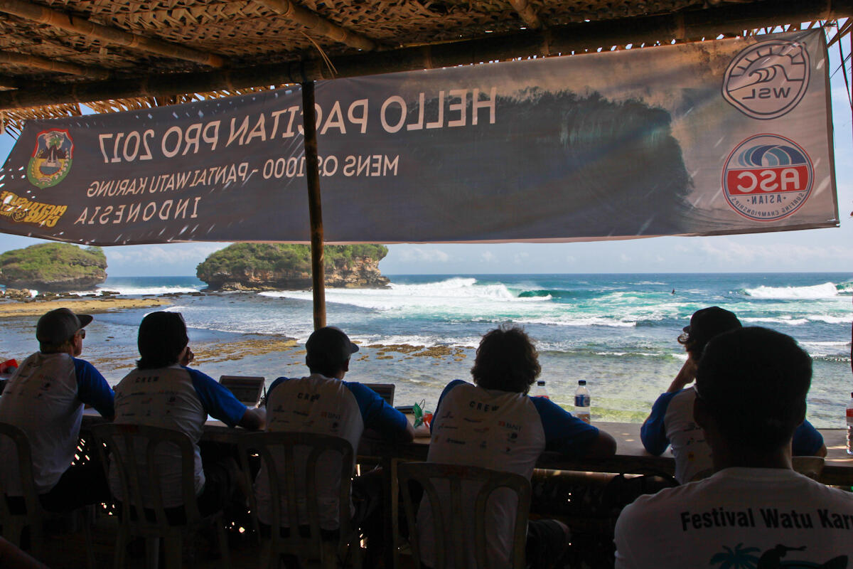 Paul nous en explique le déroulement. Après qu'une vague ait été surfée, pour qu'une note soit attribuée, les 5 juges présents dans la tour vont noter la vague, puis « la note la plus haute ainsi que la plus basse sont enlevées et on gardera les trois notes du milieu. Ainsi, ça donnera la bonne moyenne, la plus équilibrée. Et le chef juge est derrière pour harmoniser les notes si le besoin s'en fait sentir.»