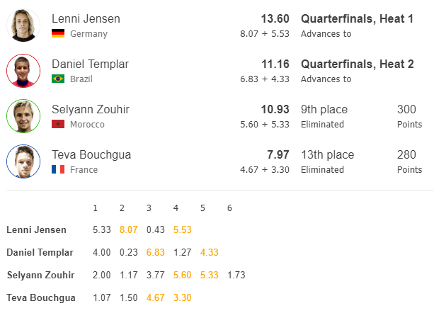 Après un Round 4 bien disputé par les riders Selyann Zouhir et Teva Bouchgua, ces derniers se sont retrouvés en Round 5 au Heat 1, face à l'allemand Lenni Jensen et au brésilien Daniel Templar. Malgré un bon battle du début à la fin, les jeunes graines de champions n'ont pas pu accéder aux quarts de finale.