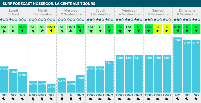 Avec les résidus du swell du week-end dernier, les lève-tôts ont pu profiter de jolis bouts ce matin, mais pour le check landais de cette semaine, seulement deux créneaux sont à lister. Jeudi marque à nouveau l'arrivée d'une houle, avec 1m et 11s de période en fin d'après midi. Gardez de l'énergie puisque dès le lendemain sont attendu des vagues jusqu'à 1,3m aux séries, 11s de période et un vent offshore jusqu'à 14h. C'est encore loin, mais dimanche s'annonce solide avec un vent side modéré toute la journée et une houle d'1,6m.