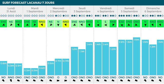 Schéma similaire en Gironde, avec un début de semaine timide puis fructueux de jeudi à dimanche. Jeudi est attendu 1,1m, 11s de période et un vent favorable. Les conditions restent bonnes jusqu'à dimanche avec un swell montant à 1,5m pour la journée de samedi. Pour le vent, profitez encore de l'orientation idéale en vous mettant à l'eau le matin avant qu'il ne tourne Nord.