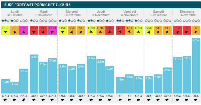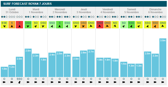 Ça surfe également le week-end, sous un vent de sud (tournant) qui se maintiendra sous les 10 km/h. La houle se maintient elle aussi autour des 2m, avec 13s de période samedi et 11s dimanche : jusqu'à 2m60 à la série samedi matin, 1m90 en fin de journée et 2m10 dimanche matin.