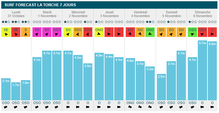 La plus belle journée de surf se dessine cependant samedi : vent de sud sous les 10 km/h et houle en baisse (2m10 le matin, 1m50 en fin de journée) pour des vagues jusqu'à 2m50 le matin et 1m80 le soir (13s de période). De belles conditions qui se maintiendront jusqu'à dimanche matin : entre 1m50 et 2m20 à la série, 11s de période et vent proche de l'offshore à 10 km/h.