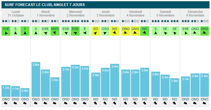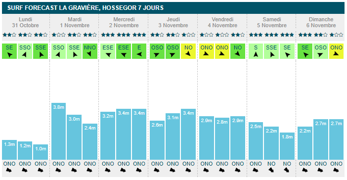 Dès mardi on trouvera de la taille à l'eau, alors qu'une houle de 3m viendra rencontrer les rives. Mardi et mercredi les surfeurs les plus expérimentés devraient avoir le champ libre sur les spots de repli pour des séries à plus de 3m sous un offshore à 10 km/h.