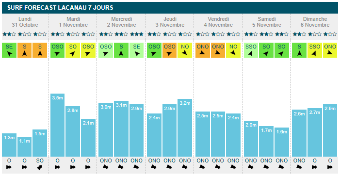 Comme dans les départements plus au nord, le vent ne sera pas du côté des surfeurs cette année. Souvent au-dessus des 30 km/h au fil de la semaine, il gênera nombre de sessions à l'eau. Un créneau semble cependant se dégager mercredi matin, découvrant des conditions solides à l'eau : entre 2m10 et 3m10 à la série, 12s de période et vent proche de l'onshore à 13km/h. Le vent reprenant en intensité sans tarder, il s'agira sûrement là de la seule opportunité de la semaine.