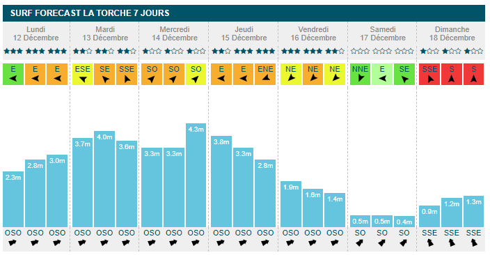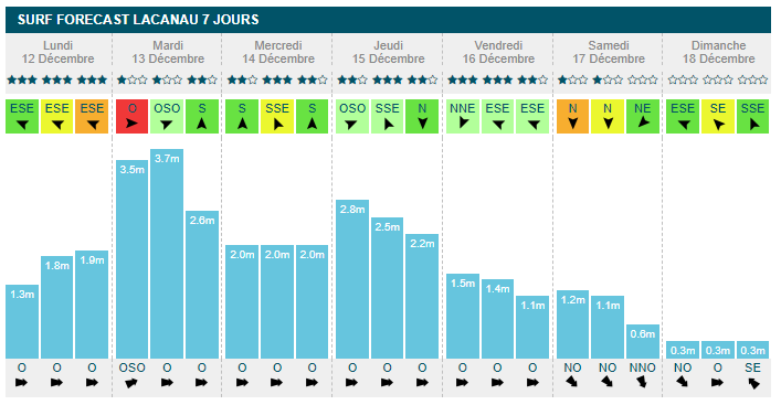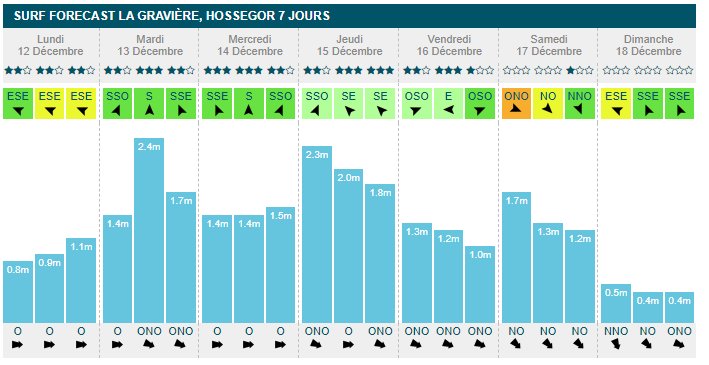 Semaine de surf compliquée en prévision, avec du vent pour empêcher nombre de mise à l'eau et une houle qui fluctue. Un créneau tout de même à surveiller mercredi en fin de journée, avec une accalmie dans le vent (15 km/h orienté Sud-Ouest) découvrant à l'eau des séries de 2m (12s).