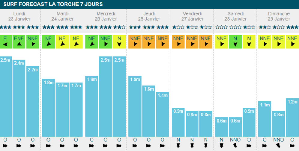 Deux sessions principales se dessineront cette semaine, avec un petit mètre et 13s de période prévus lundi matin et un vent side/offshore d'une vingtaine de km/h pour accompagner la session. Un vent qui tournera en side shore la journée de mercredi, mais qui baissera en intensité par la même occasion, alors que la houle prendra le chemin inverse pour monter à 1m20 à la série en fin de journée.